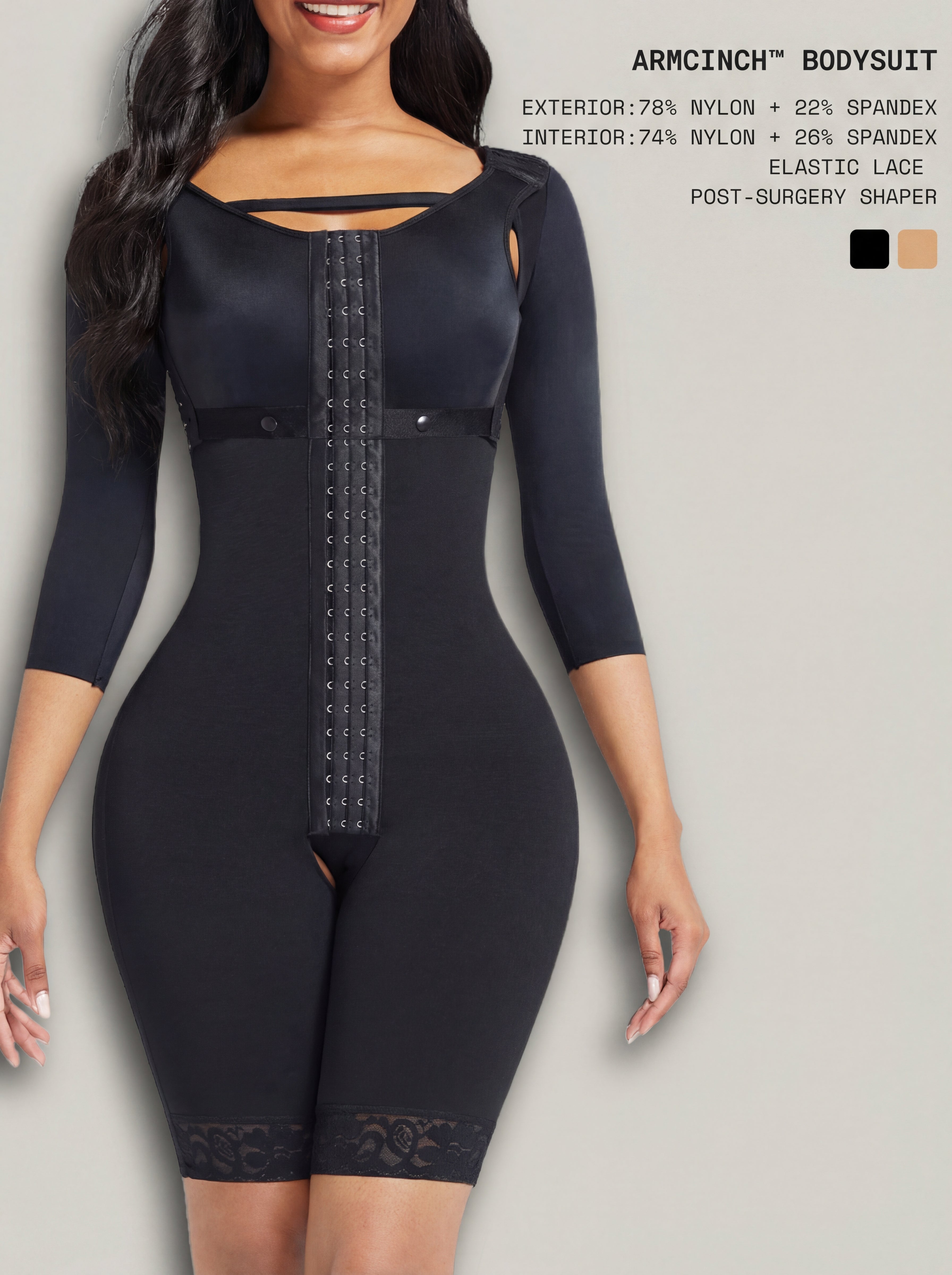 ArmCinch™ Bodysuit is a sleeve-sculpting, post-surgical shaper designed to smooth, cinch, and refine your silhouette into a clean hourglass line. Adjustable front hooks let you customize compression through the waist and tummy, while the sleek longline cut shapes through the hips and thighs for a polished finish under clothing. The detachable bra design allows you to pair your favorite bra for your ideal lift and comfort. Finished with high-stretch lace trim, it stays feminine, secure, and effortlessly wearable.