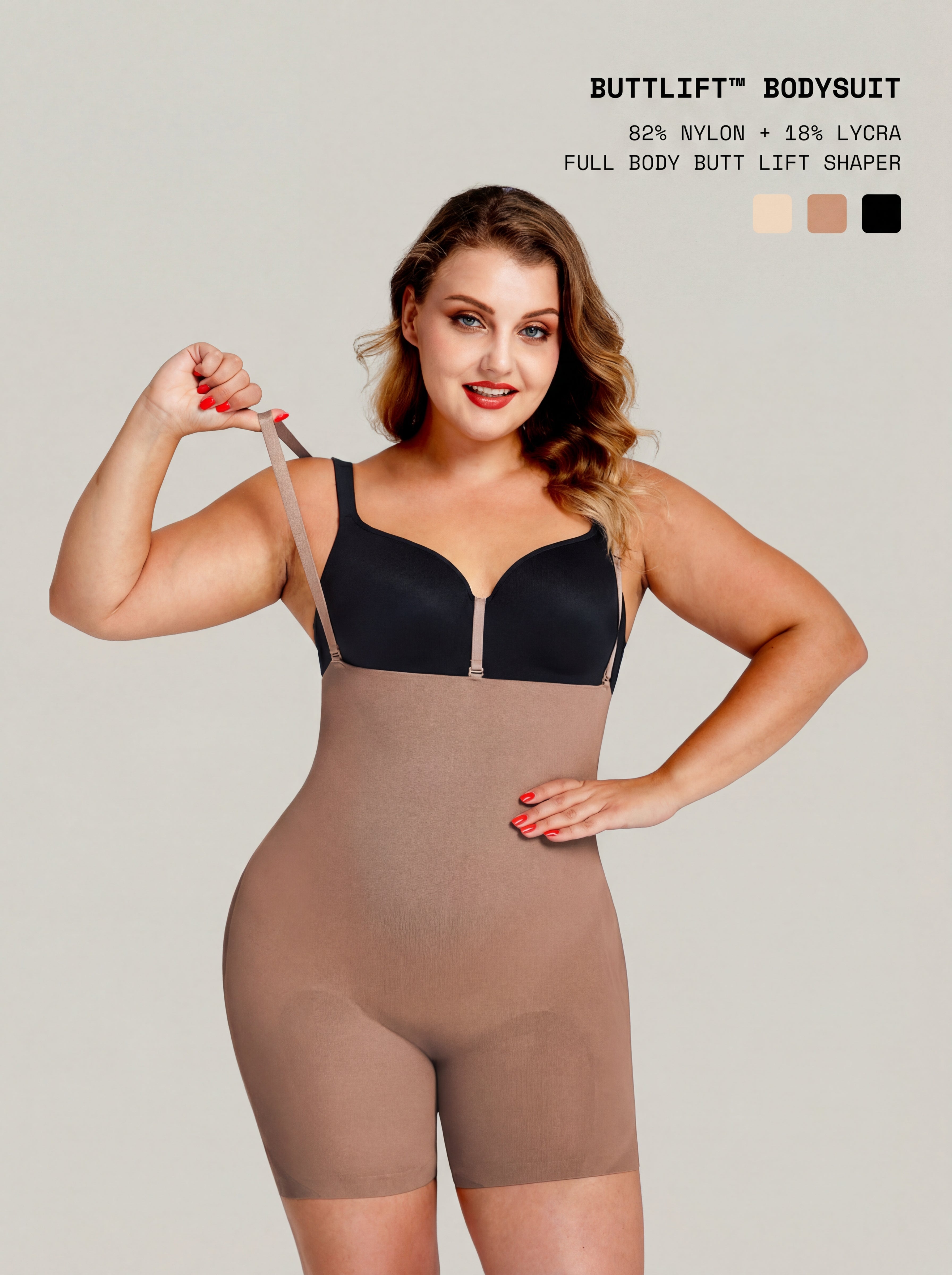 Designed to smooth, lift, and support, ButtLift™ Bodysuit delivers full-body shaping with a natural, flattering finish. The high-waist compression panels target the tummy and waist for a smooth silhouette, while the breathable mesh butt design enhances lift without flattening. Soft, skin-friendly fabric keeps the bodysuit comfortable for all-day wear, and the full-body structure provides gentle back support to help improve posture. Seamless under clothing, it’s made for everyday confidence and comfort.