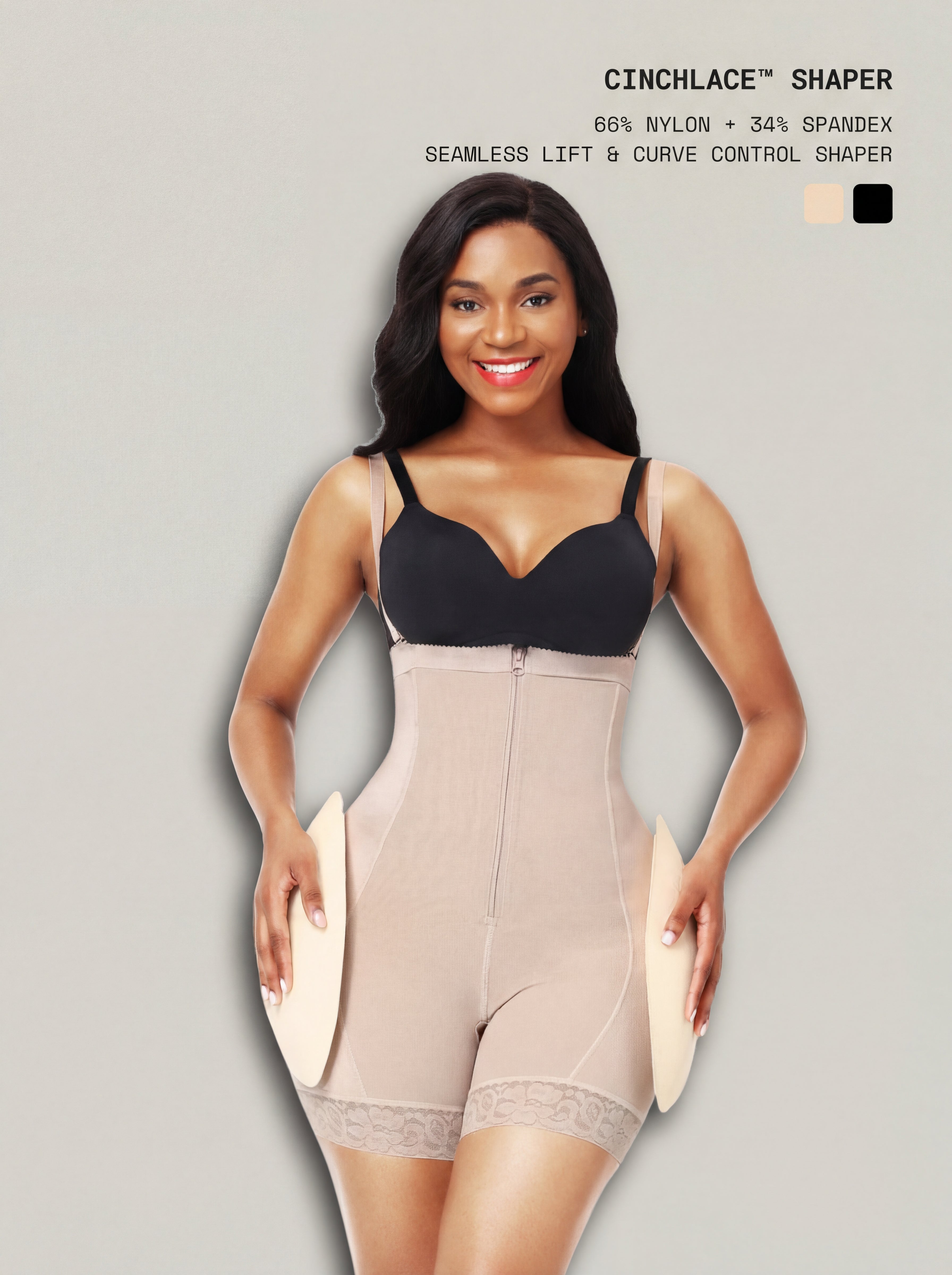 - Removable Hip + Butt Pads Customizable curves for a fuller hourglass look