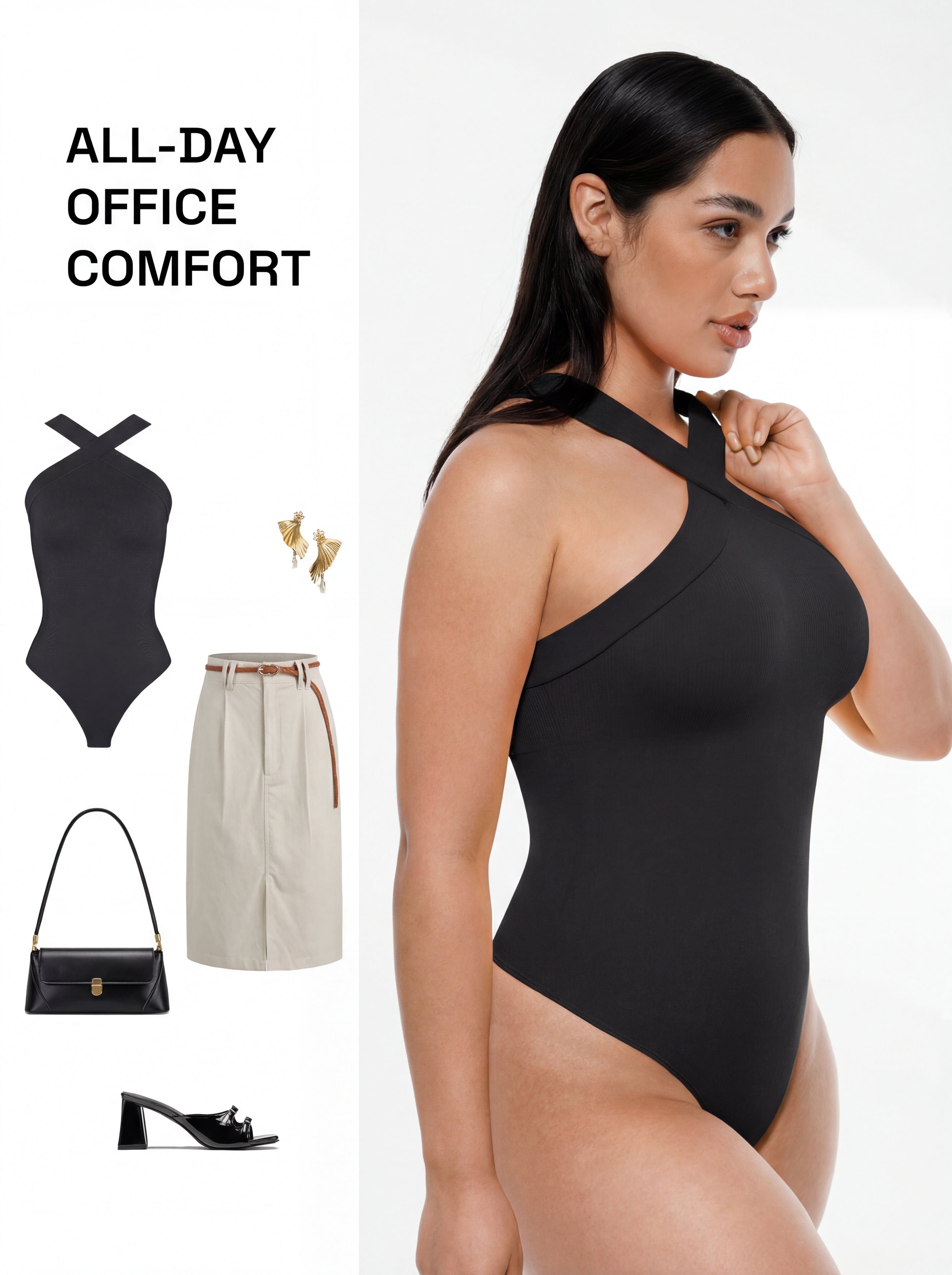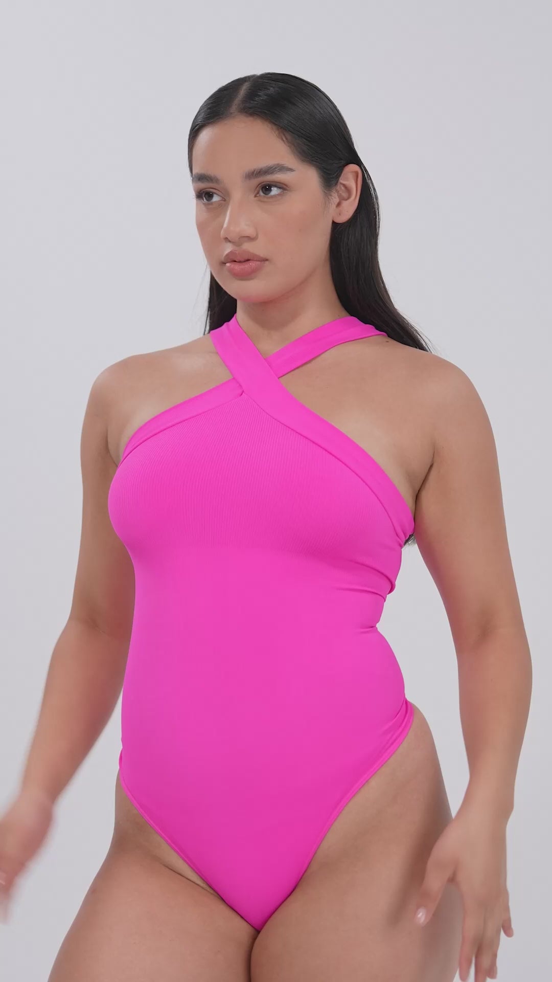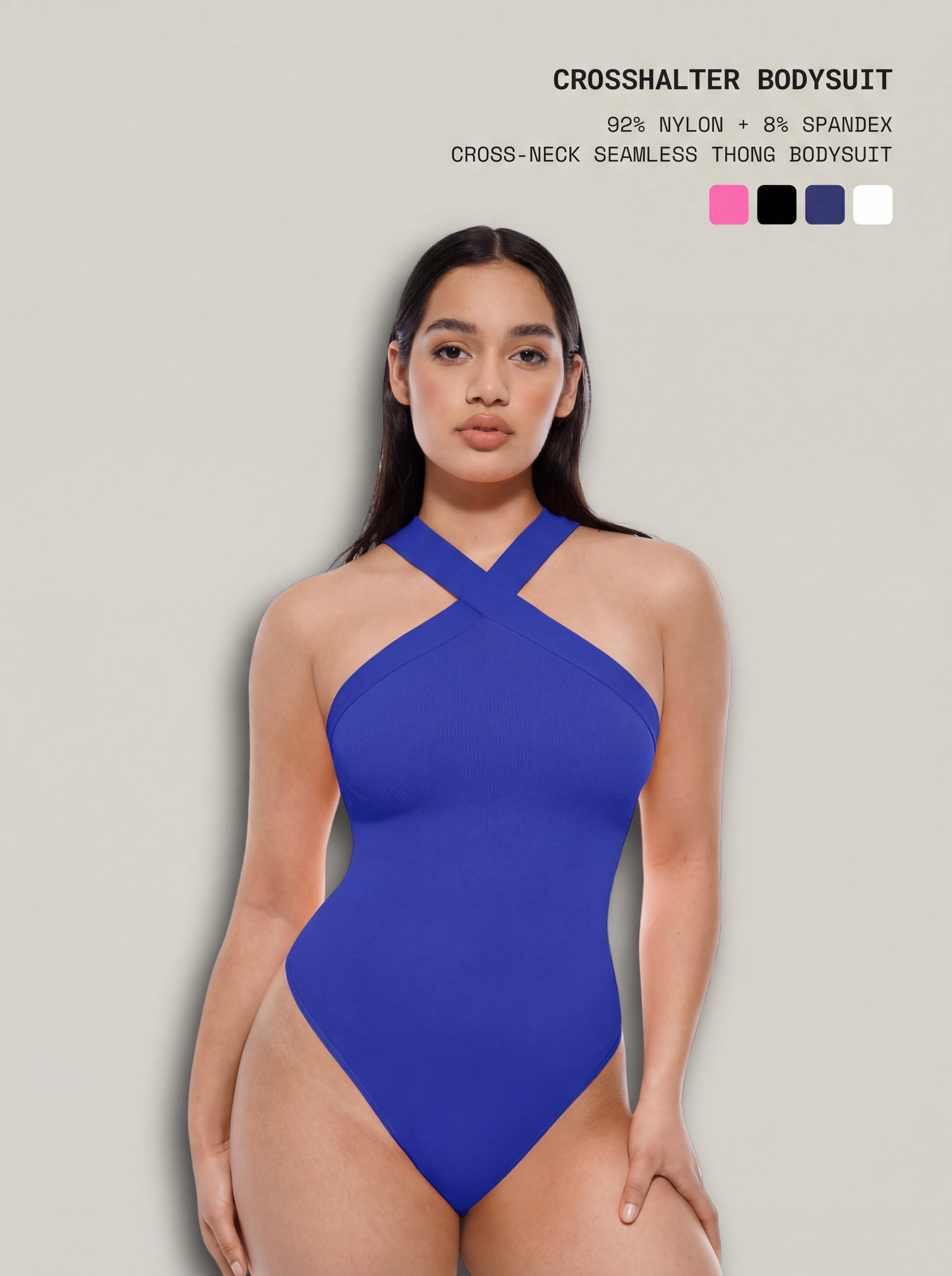 CrossHalter Bodysuit is a seamless crossover halter thong bodysuit designed for effortless style and comfortable shaping. The cross-collar halter neckline delivers a clean, modern look, while reinforced weaving at the waist and lower abdomen provides gentle compression and smoothing. Crafted with a seamless knitting process and soft textured fabric, it fits close to the body without restriction. Finished with a hidden crotch closure and thong back, it stays invisible under tight-fitting outfits and is perfect for everyday mix-and-match styling.