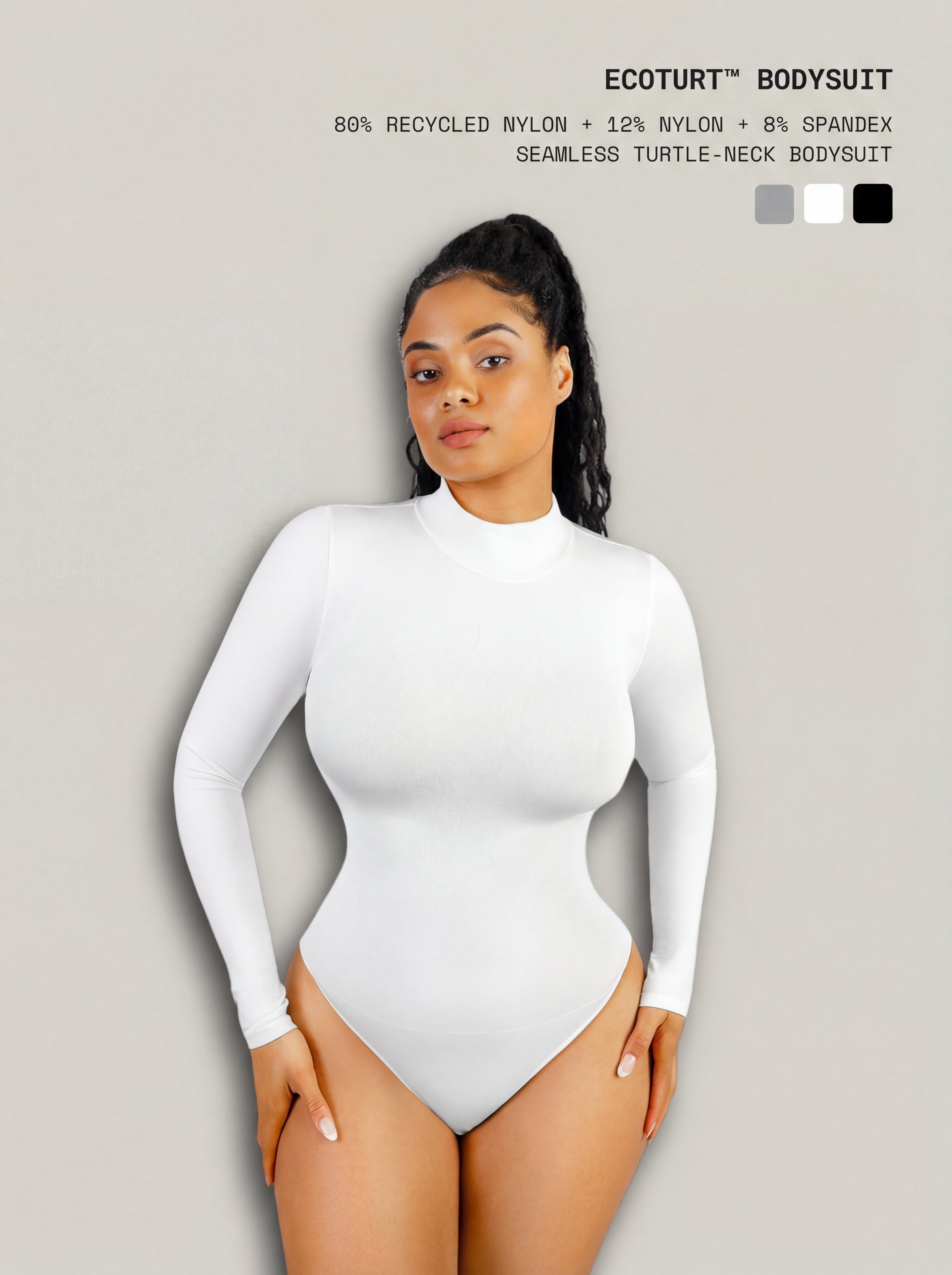 Meet EcoTurt™ Bodysuit, the seamless turtleneck essential crafted with recycled nylon for a sleek silhouette and a lighter footprint. The smooth, high-elastic knit hugs your body like a second skin, while a tighter-woven waist panel delivers 360° control for a softly cinched shape. Polished enough to wear as a top and streamlined enough to layer, it stays comfortable from morning to night. Finished with a thong back and adjustable double-row snaps for an invisible fit under everything.