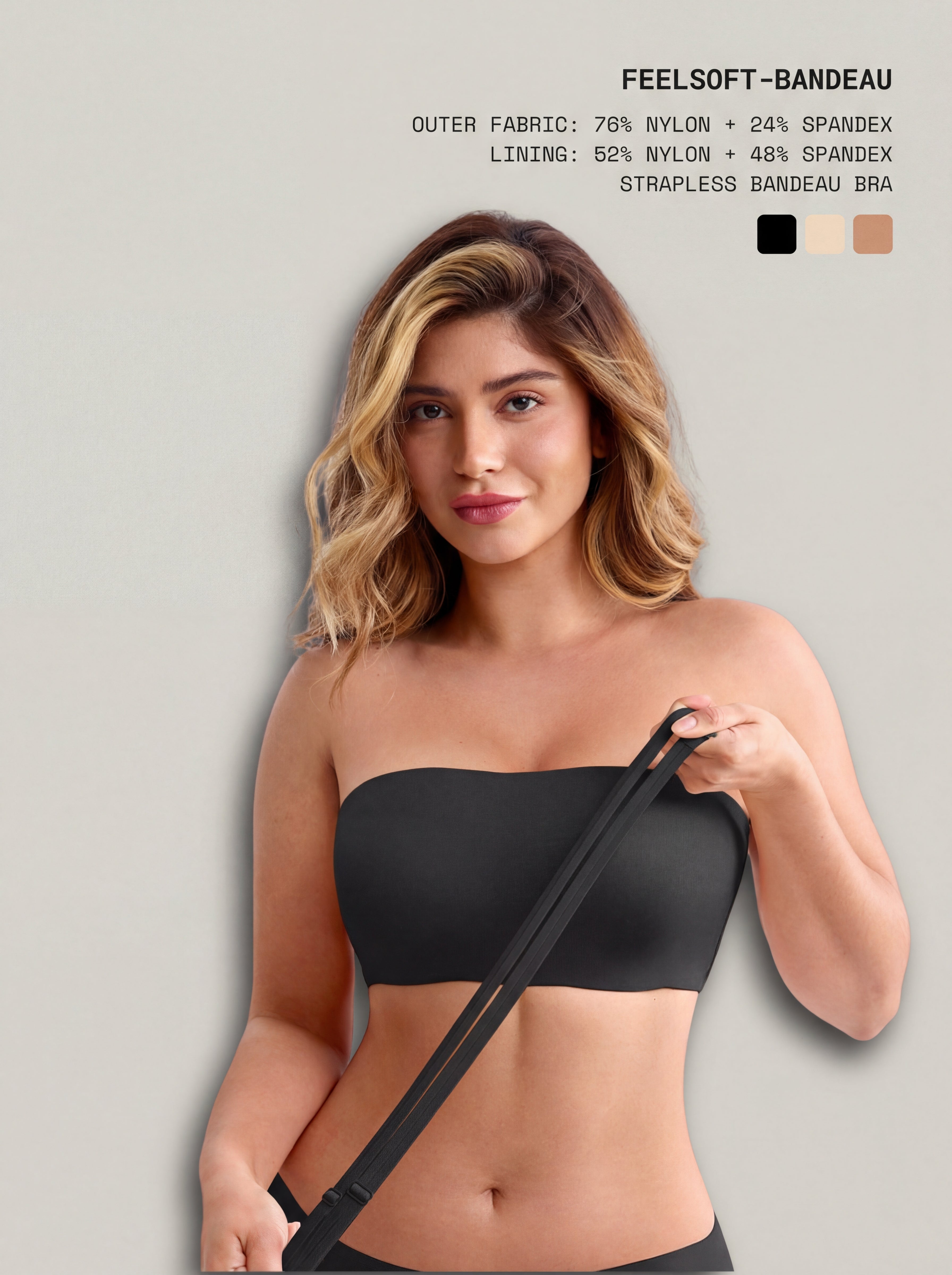 The FeelSoft Bandeau bra is designed to deliver secure support, smooth shaping, and reliable nipple coverage without sacrificing comfort. Featuring anti-slip silicone grippers, side boning, and fixed molded cups, it stays firmly in place while maintaining a clean, seamless look under clothing. Crafted with FeelSoft fabric technology and 360° stretch, this bandeau offers second-skin comfort and flexibility. Detachable straps provide versatile styling options, making it a staple piece for strapless, off-shoulder, or everyday outfits.