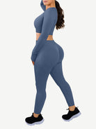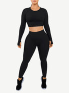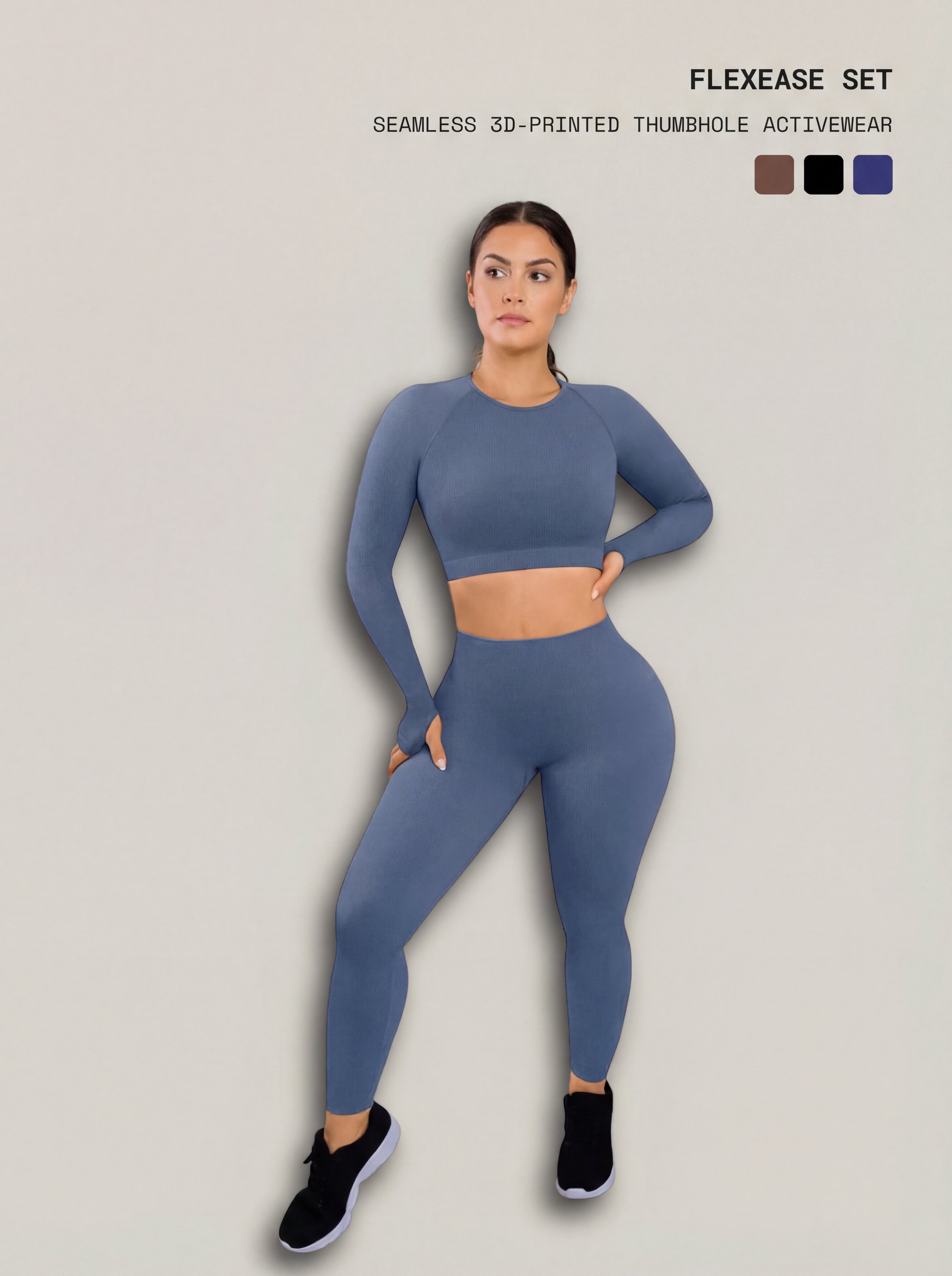 FlexEase Set is your eco-forward, seamless duo designed to sculpt lightly while feeling impossibly smooth on the skin. The long-sleeve crop top offers a clean, supportive fit with a subtle push-up effect, while the high-rise leggings flatter the waist and tummy with sleek, body-contouring compression. Thumbhole cuffs keep everything perfectly in place for workouts and off-duty days alike. Polished, flattering, and made to move, this is the set you’ll live in