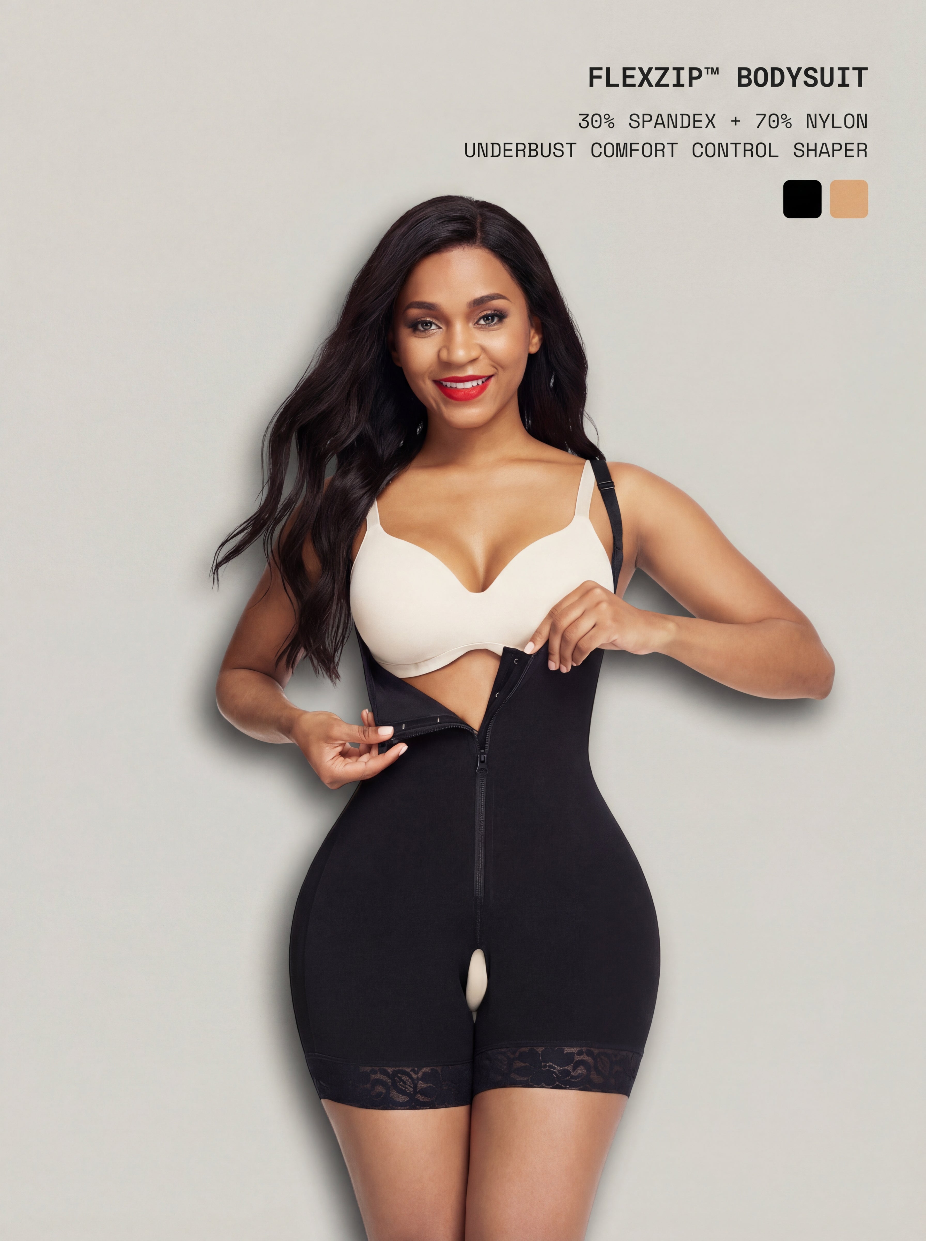 Sculpt and support with FlexZip™ Bodysuit—an underbust, postsurgical-ready design that glides on with an ultra-flat zipper over hidden hooks. High-elastic mesh hugs the waist and hips while a hip-cup lift rounds your curves naturally. Adjustable straps and anti-slip lace hems keep everything smooth and secure. An open crotch offers effortless, on-the-go ease