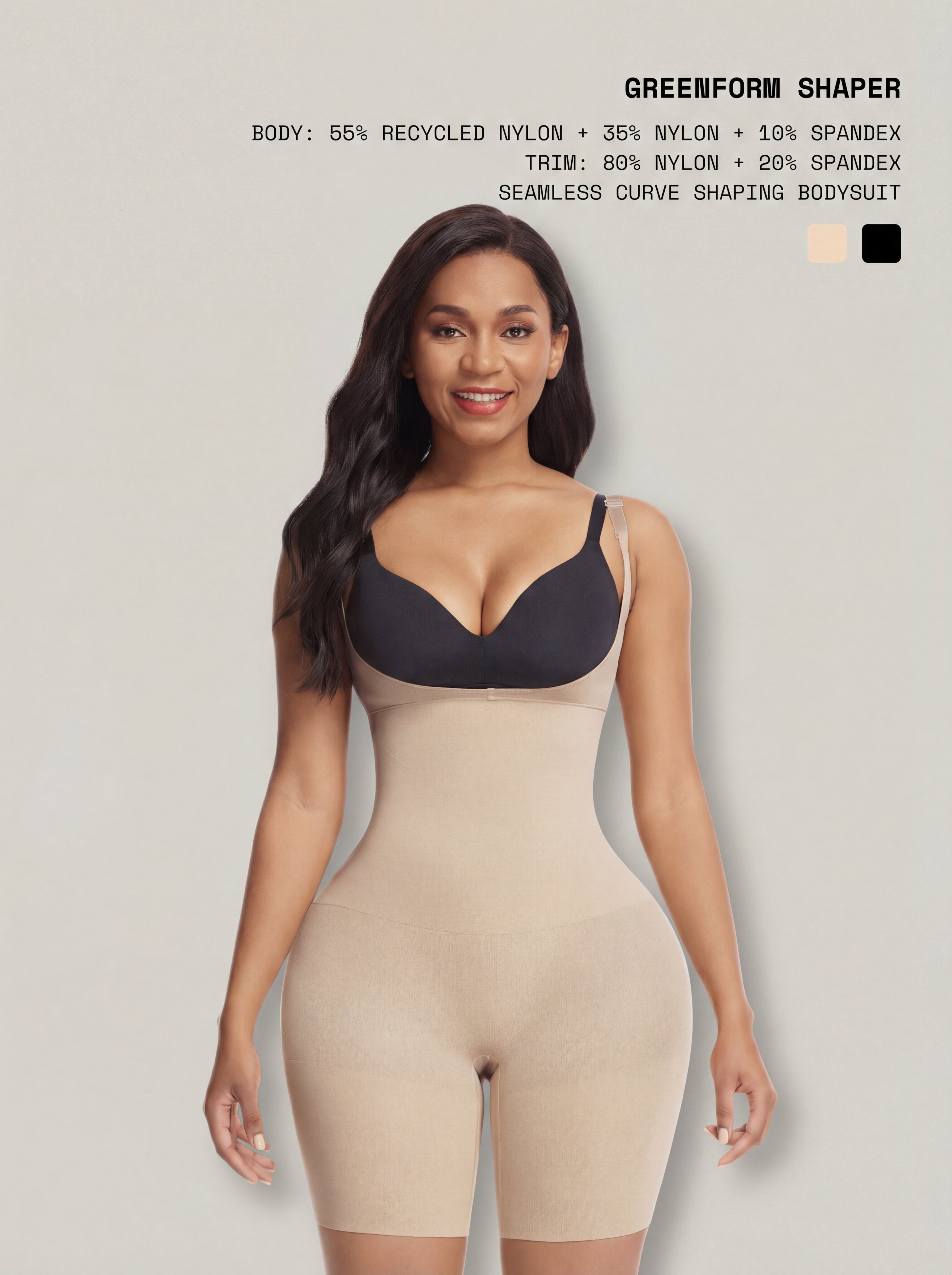 The GreenForm Shaper is an eco-friendly, seamless open-bust mid-thigh shapewear piece designed to deliver instant smoothing with a second-skin feel. Made with recycled nylon and high-stretch fabrics, it offers excellent recovery while sculpting the abdomen, thighs, and curves. Double-layer compression panels enhance tummy flattening and leg contouring, while a butt-lifting design shapes naturally without flattening. Thoughtful details like a non-slip waist, overlapping crotch, and anti-rolling adjustable straps make this shaper supportive, comfortable, and practical for all-day wear.