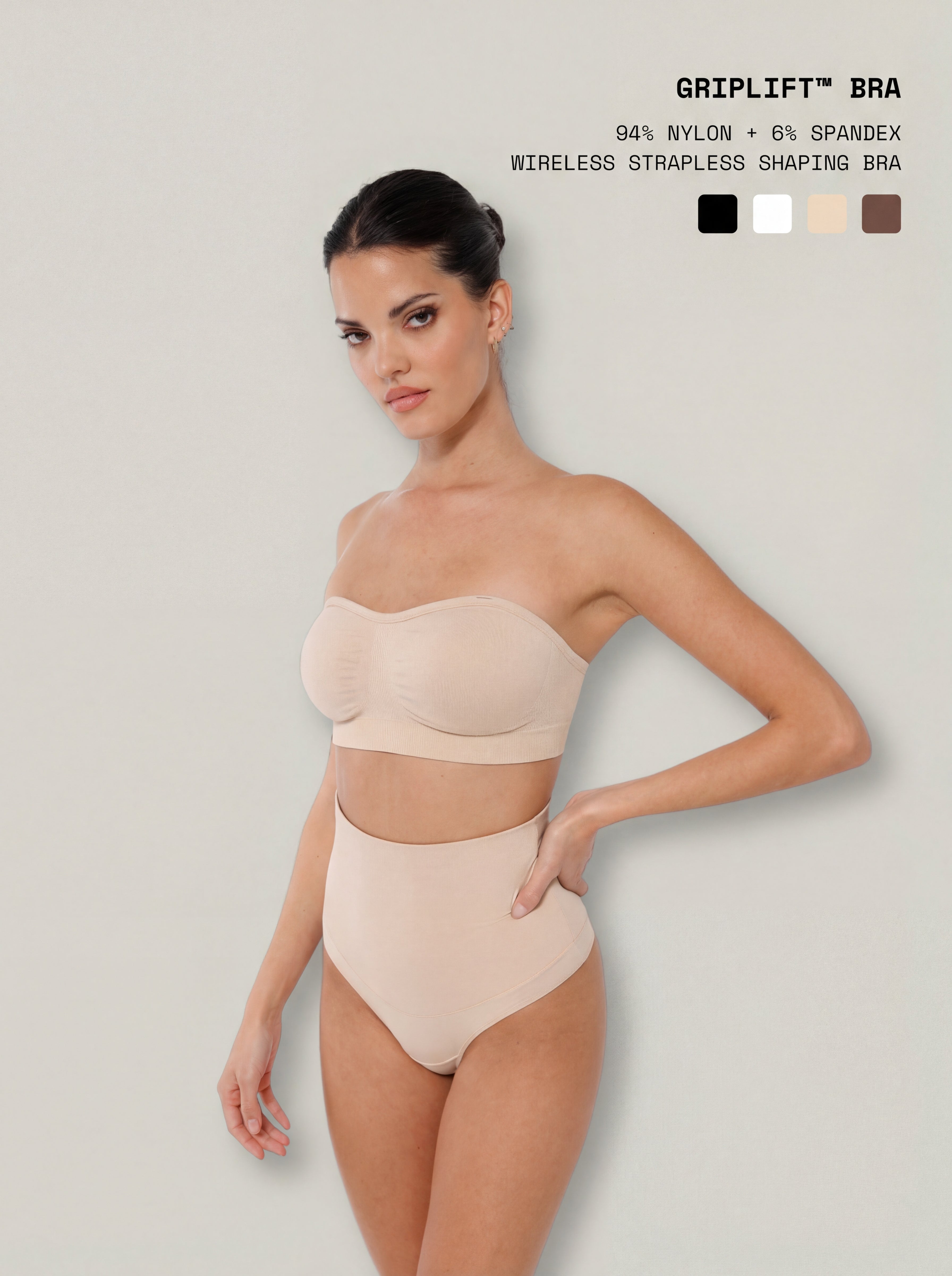 Secure, smooth, and beautifully supportive, GripLift™ Bra is designed for confident strapless wear with a barely-there feel. The seamless silhouette features anti-slip silicone along the top edge to keep everything in place, while an inner compression structure provides light lift and shaping. With removable pads, a wide adjustable back, and ultra-soft stretch fabric, it delivers all-day comfort for everyday outfits and special looks alike.