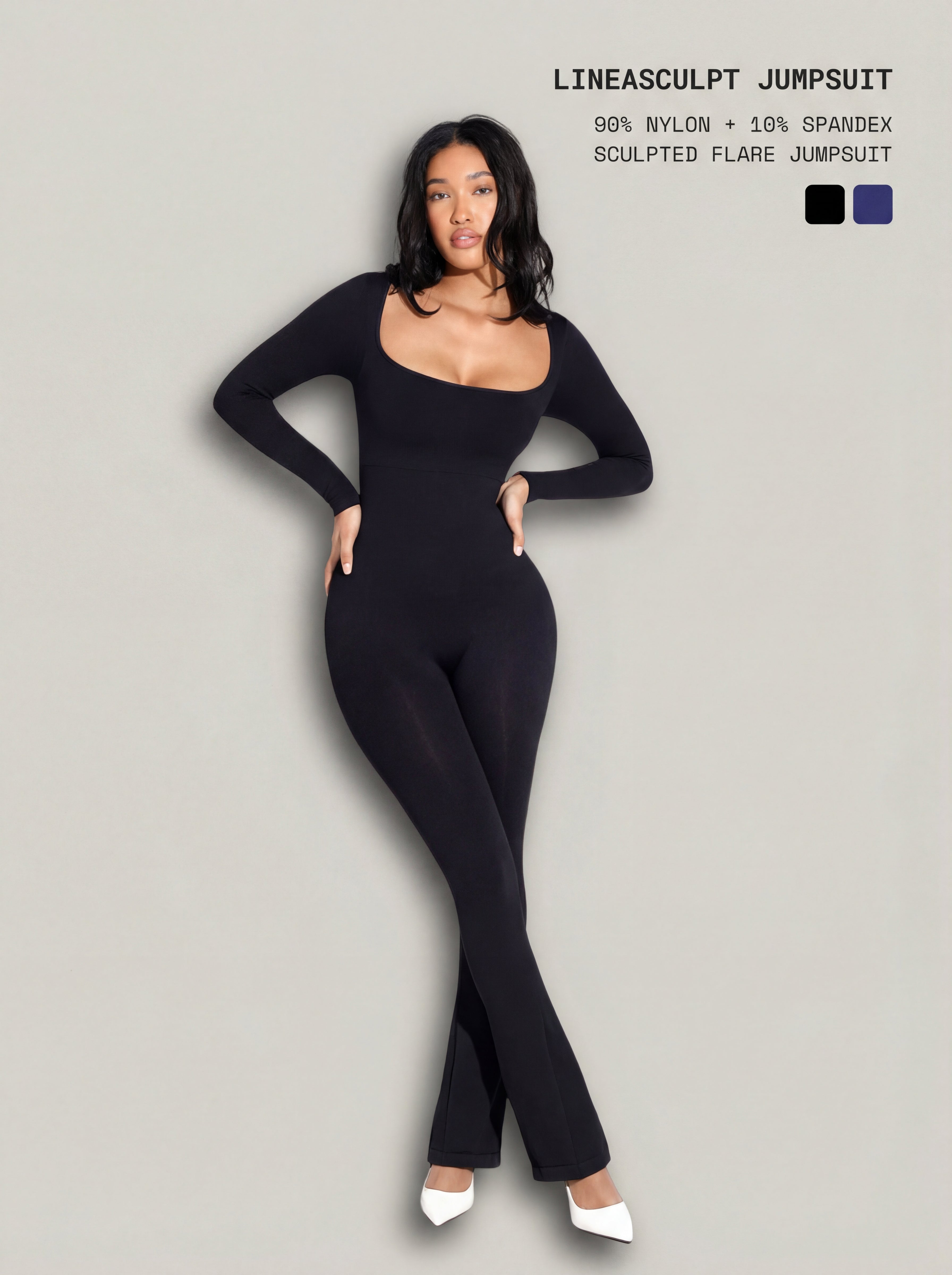 The LineaSculpt Jumpsuit gives me the most flattering shape—the square neckline and flared legs make my waist look so snatched.