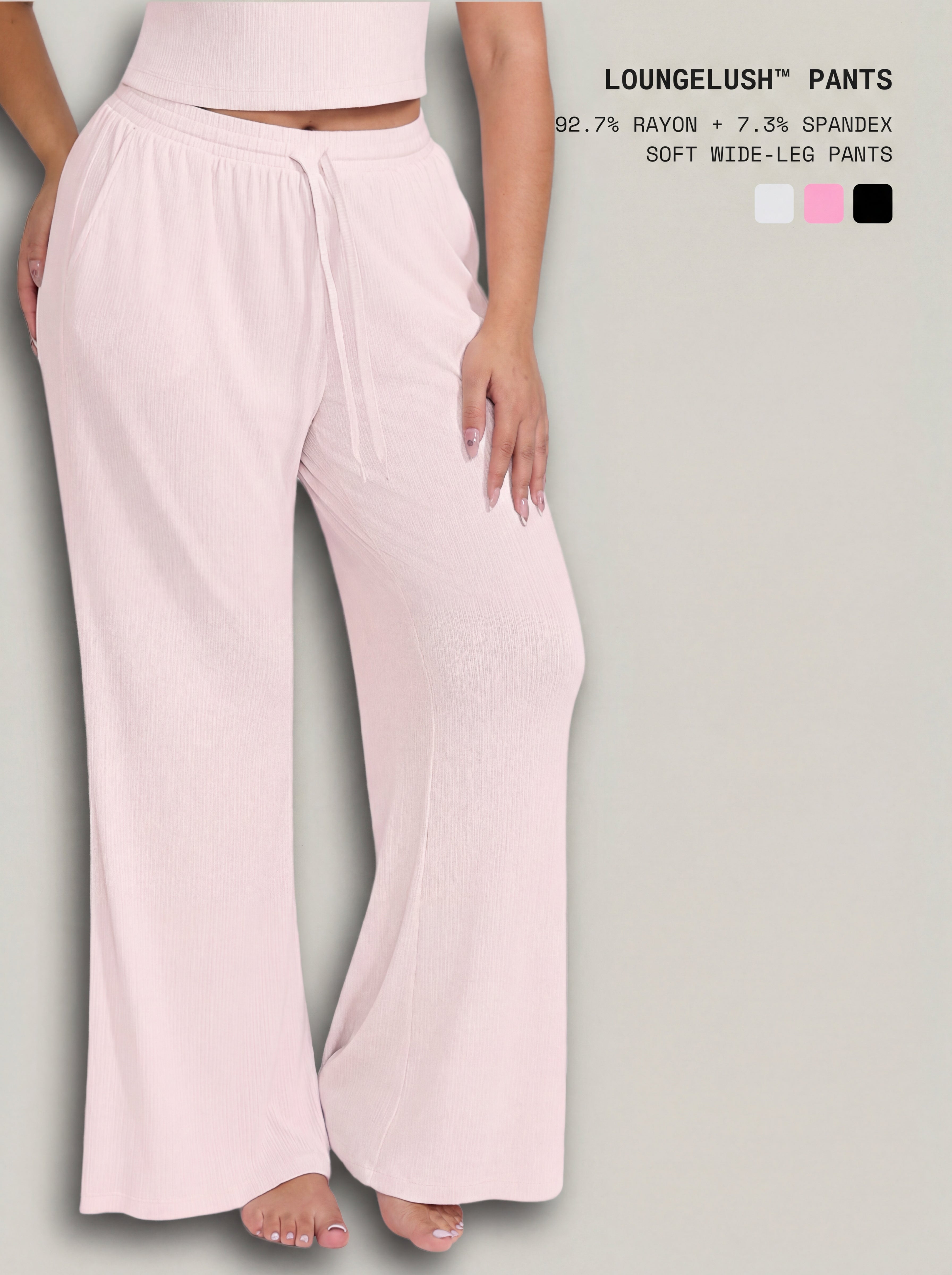 Slip into effortless polish with LoungeLush™ Pants, designed to drape beautifully while keeping you cool, comfy, and put-together. The ultra-soft rayon rib fabric feels gentle on skin and stretches with you for all-day ease. A flattering mid-rise fit, adjustable tie waist, and relaxed wide-leg silhouette make these your new go-to for lounging, errands, and casual days out. Finished with side pockets for that everyday, can’t-live-without-it functionality.