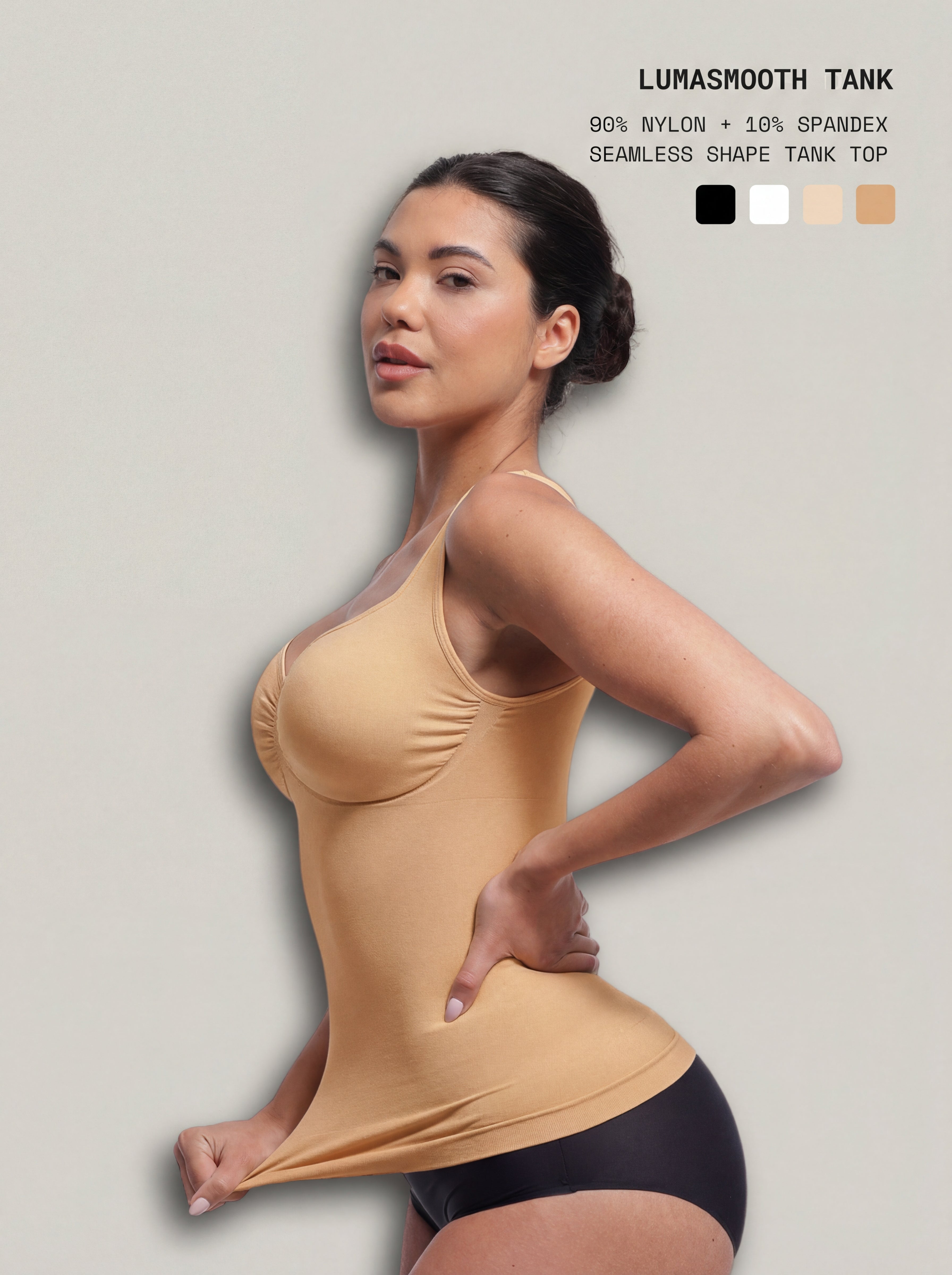 Soft, sculpting, and effortlessly flattering, LumaSmooth Tank is designed to smooth the waist and abdomen while offering natural, wire-free bust support. The seamless construction and high-stretch fabric gently contour the body without restriction, creating a refined silhouette that feels comfortable all day. A pleated bust and diamond neckline enhance natural curves while eliminating the need for a bra. Finished with a loose hem that prevents rolling, it’s perfect for everyday wear, layering, or lounging.