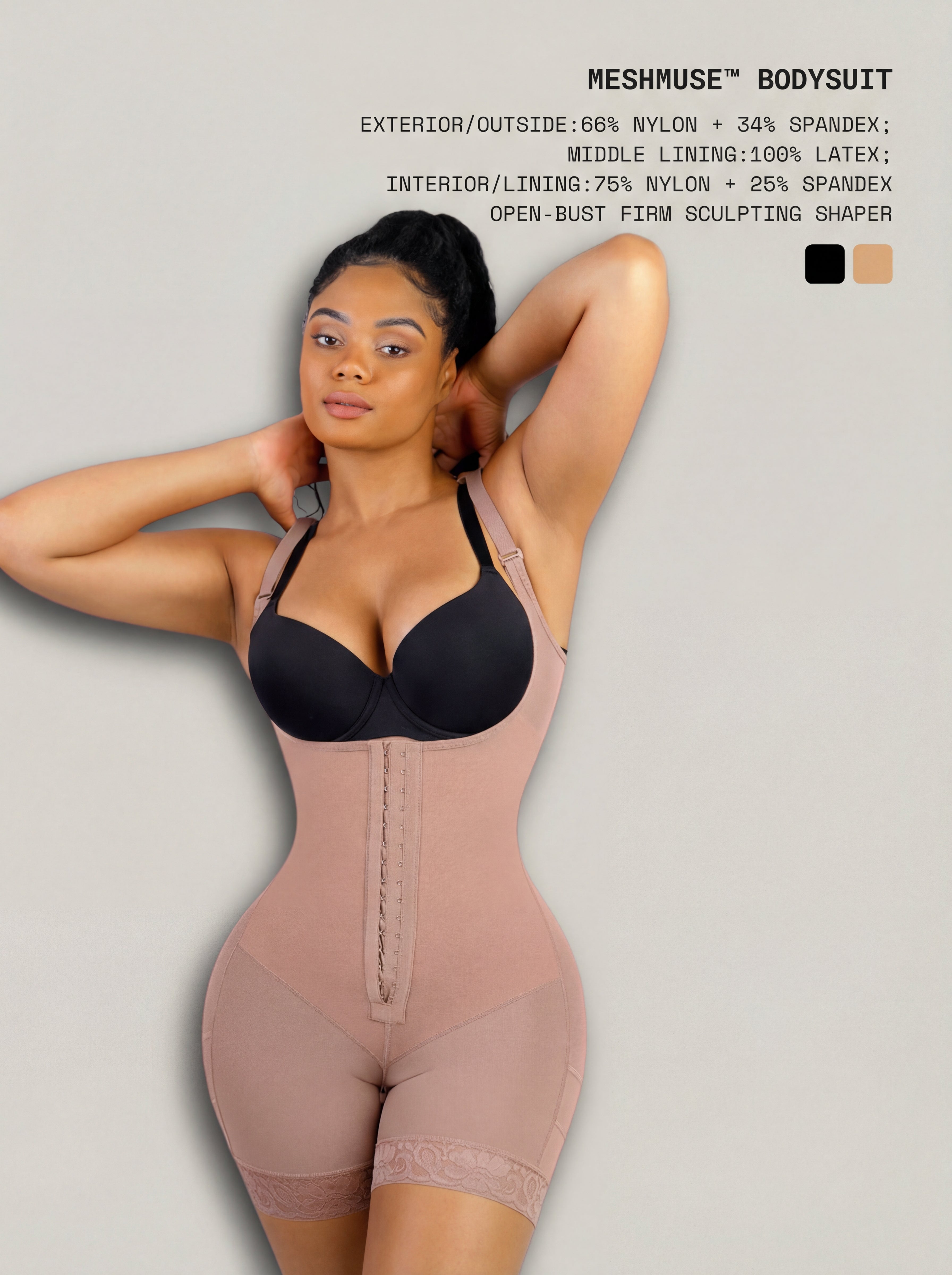 Meet MeshMuse™ Bodysuit—an open-bust, firm-compression one-piece engineered to cinch the waist while keeping you cool. A perforated latex core targets the tummy, and sculpting power-mesh smooths the back and thighs. Elegant lace hems stay flat under clothing, and the discreet zip-crotch makes on-the-go moments effortless.