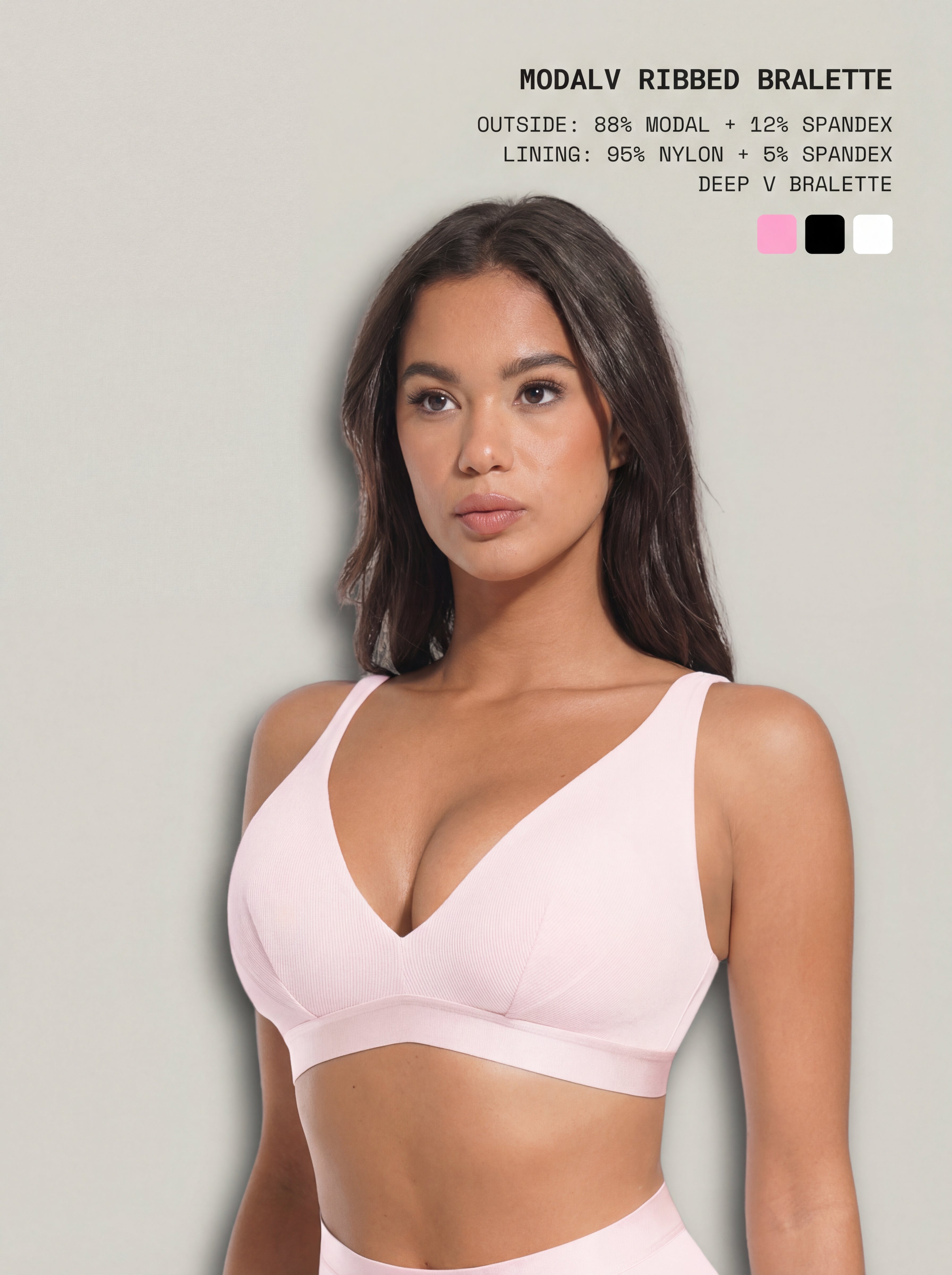 The ModalV Bralette is a deep V-neck, all-day comfort bralette designed for effortless wear at home or on the go. Made with soft ribbed modal fabric, it delivers a lightweight, breathable feel with a naturally flattering fit. Featuring removable pads, adjustable straps, and a multi-row adjustable back closure, this bralette offers flexible light support while maintaining a relaxed, non-restrictive feel for everyday use.