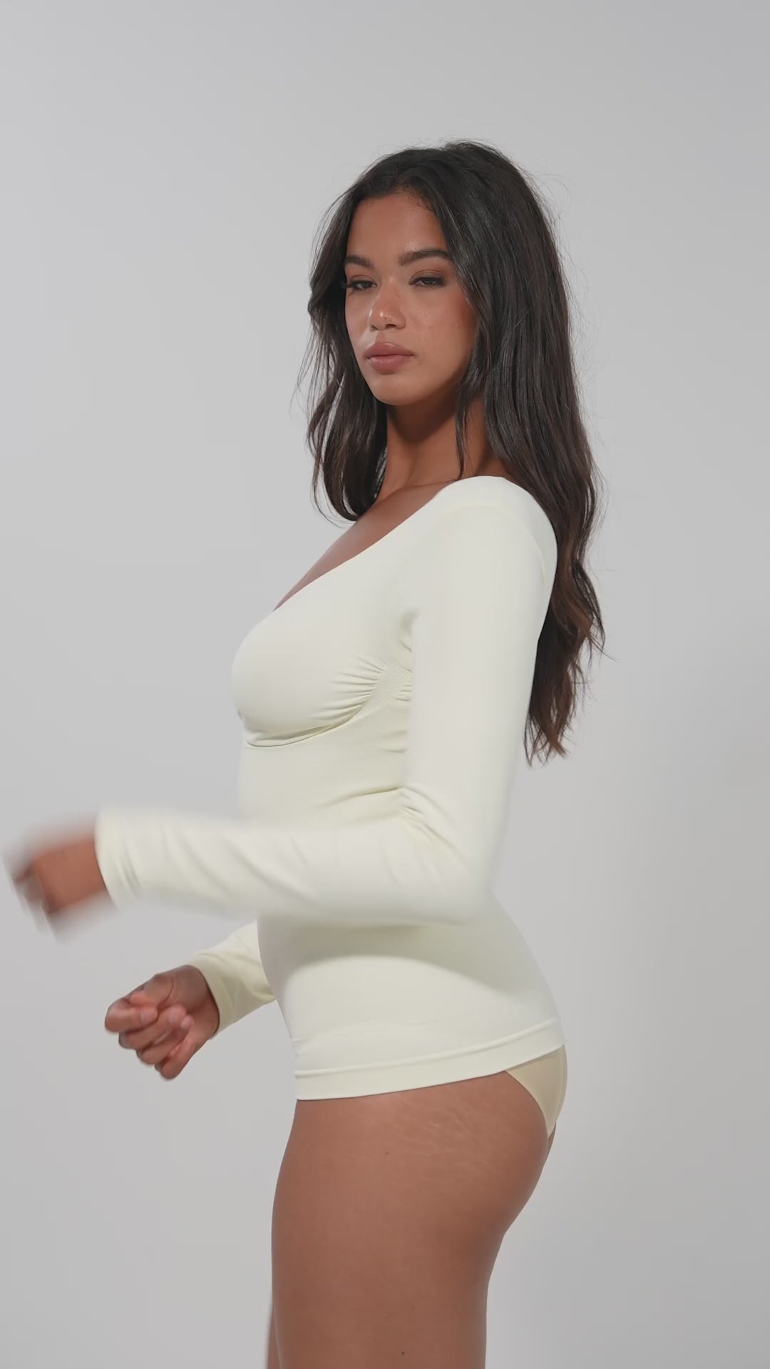 Meet NeckSculpt™ Top, a seamless long-sleeve shaping essential designed to support the bust and smooth the waist with a sleek, elevated finish. Its diamond neckline highlights the collarbone while the sculpting knit hugs your midsection for a refined silhouette. The pleated bust design creates a naturally flattering shape—so you can skip the bra with confidence. Soft, anti-sheer, and ultra-stretchy, it’s the perfect combination of comfort and contour.
