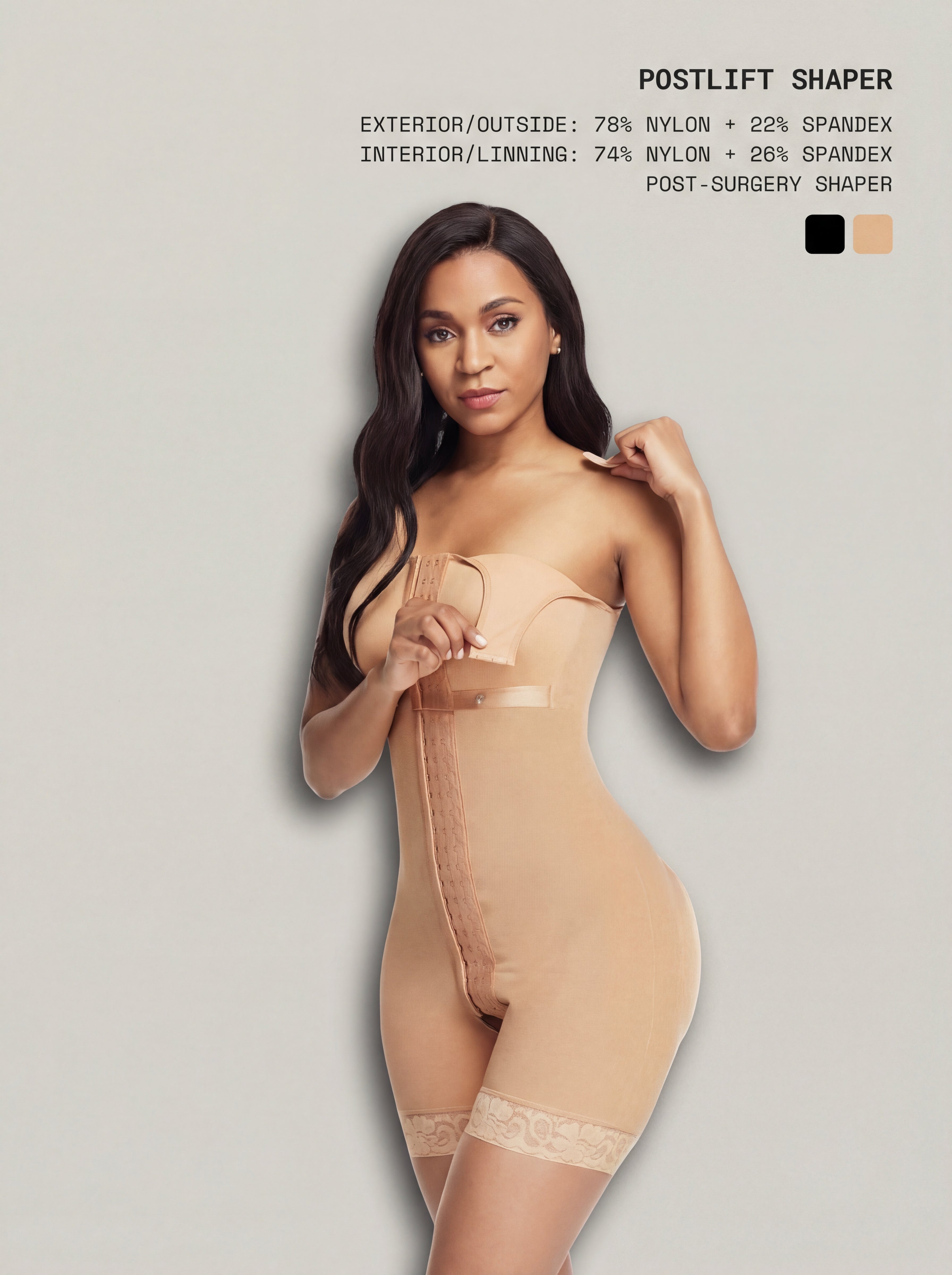 The PostLift Shaper is a post-surgical body shaper designed to provide firm tummy control while enhancing the buttocks with comfortable, supportive compression. Built with adjustable hook closures and high-elastic chest fabric, it adapts easily to different body and bust shapes. The open crotch design allows convenient bathroom access, while anti-roll leg openings help maintain a smooth, secure fit throughout the day. Dual-layer construction delivers durability, stretch, and recovery ideal for post-operative or everyday shaping needs.