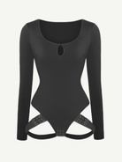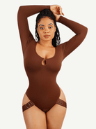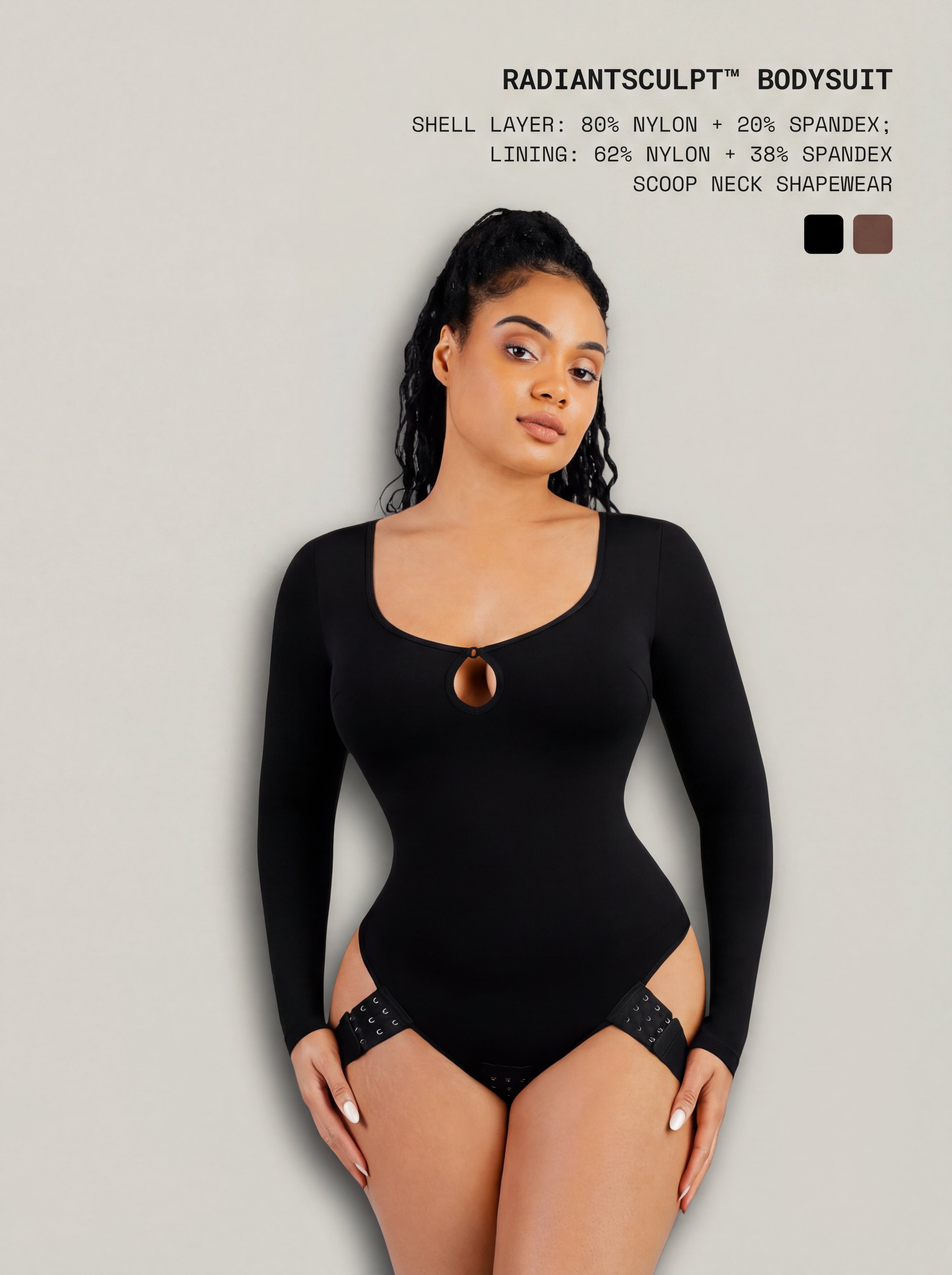 RadiantSculpt™ Bodysuit is your sleek long-sleeve shaper with a subtly sexy scoop-neck cutout. Double-layer chest coverage and an underbust support band keep you secure, while smoothing panels contour the waist and abdomen. Finished with a thong back and adjustable lift straps for a clean, curve-enhancing fit.