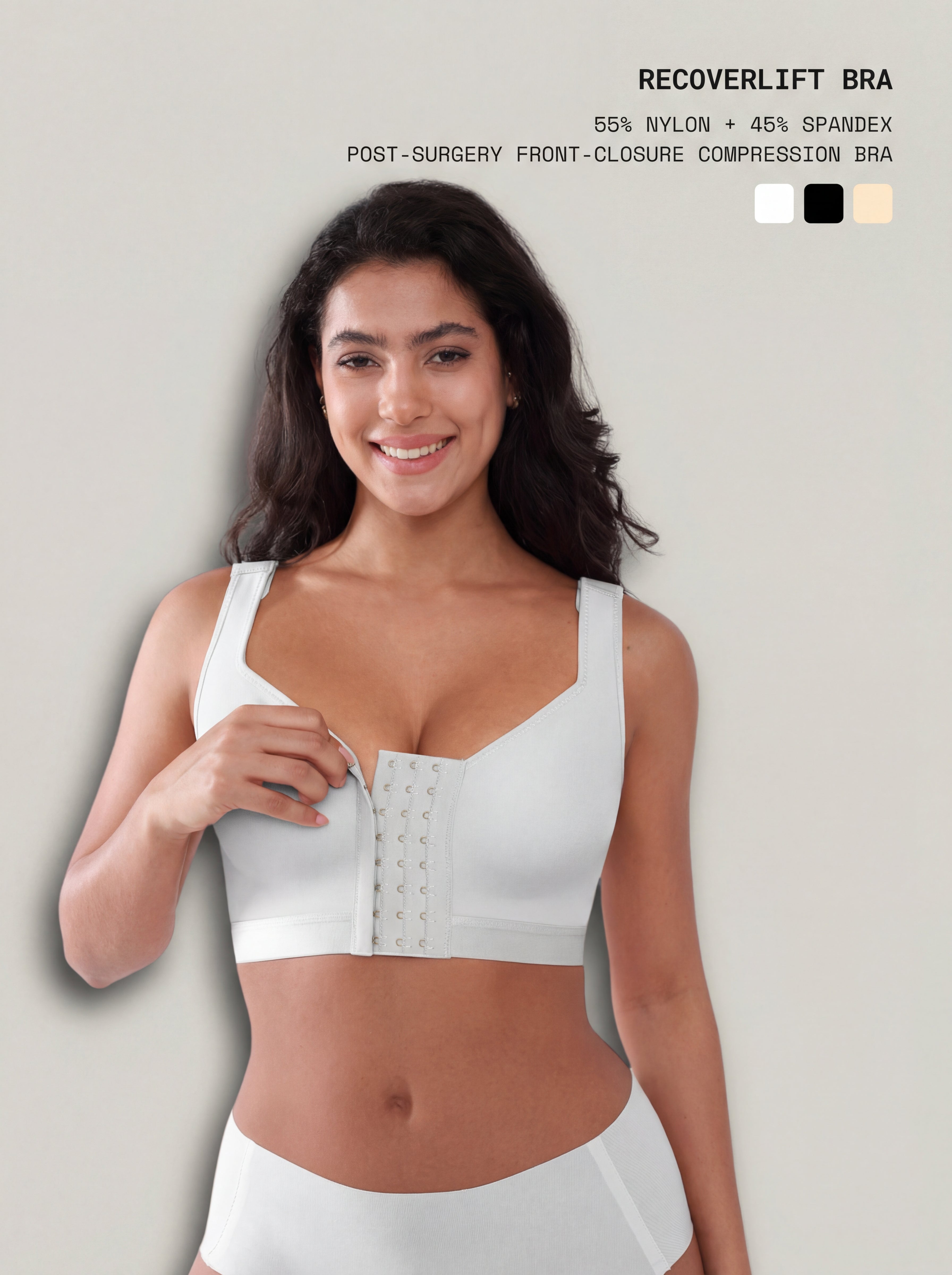 Meet RecoverLift Bra, a premium post-surgery compression bra designed to support, shape, and stabilize with soft confidence during recovery. Its 3D molded cups and built-in support pads create a smooth, natural silhouette while delivering gentle lift without pressure. The front 3-row closure allows adjustable compression as your body heals, and the wide elastic hem keeps everything secure and supported. Finished with breathable, high-stretch fabric and minimal seams, RecoverLift Bra keeps you comfortable, protected, and beautifully supported all day.