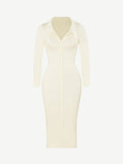 A refined, collared shirt dress crafted in a seamless wide-rib knit for sleek, waist-defining shape. RibSculpt Dress features a concealed front zip with a faux placket and a tighter rib at the waist and lower abdomen to gently cinch without stiffness. The single-layer body drapes smoothly, delivering polish and comfort from desk to dinner—made with recycled yarns for a feel-good finish.