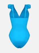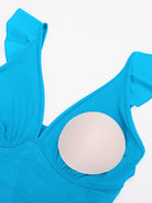 - Ruffled Neckline A playful flutter detail that frames the décolletage while helping soften the look of side breast bulges