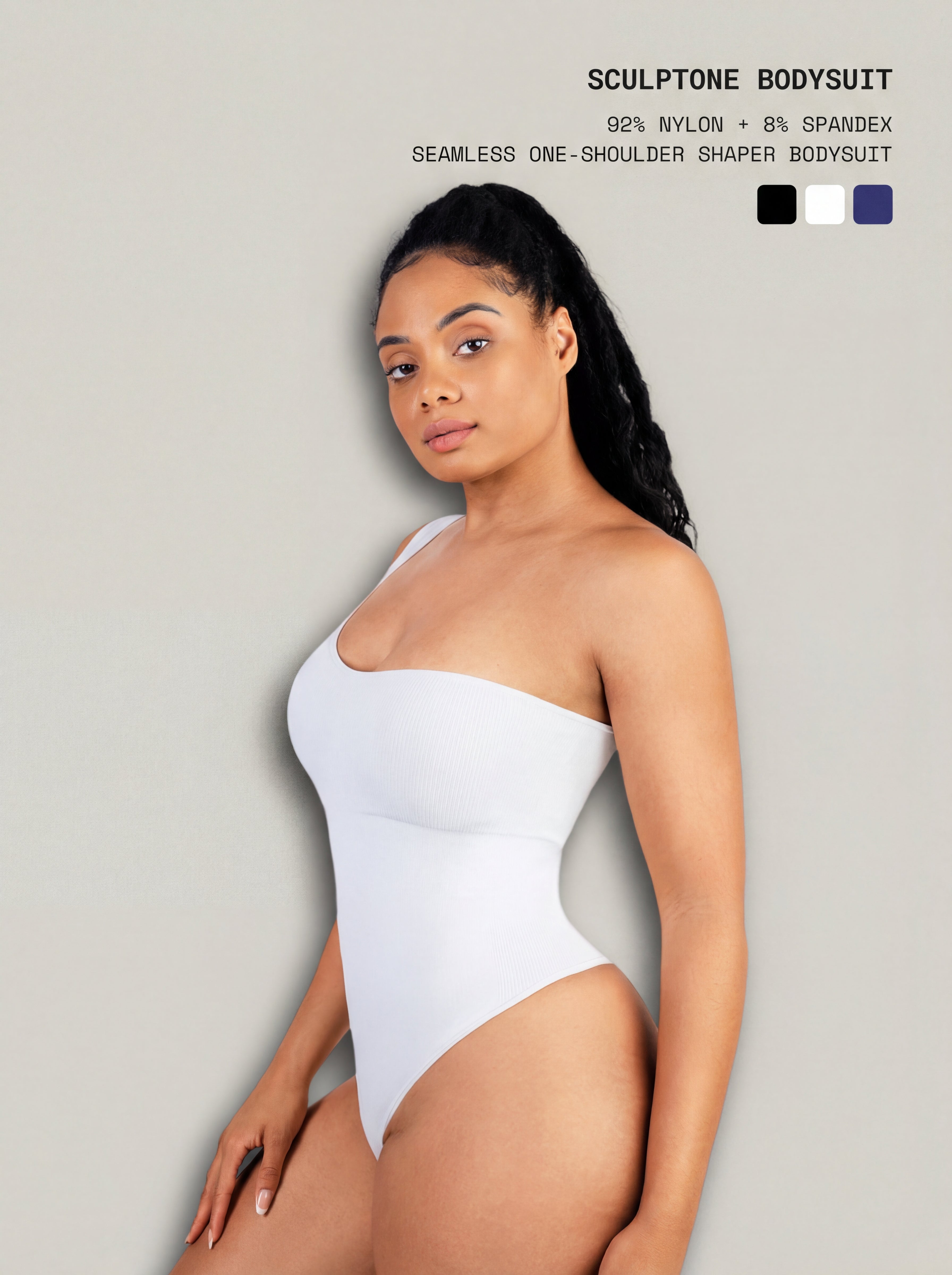The SculptOne Bodysuit is a seamless one-shoulder shaping essential designed to contour the waist and smooth the tummy while delivering a modern, sexy silhouette. The off-shoulder design subtly highlights the shoulders, making it easy to dress up or down. Ribbed twill fabric provides a buttery-soft feel with comfortable stretch, while targeted compression at the waist and lower abdomen enhances shaping. Finished with a thong-style back and hidden snap closure crotch, this bodysuit stays invisible, practical, and flattering all day.