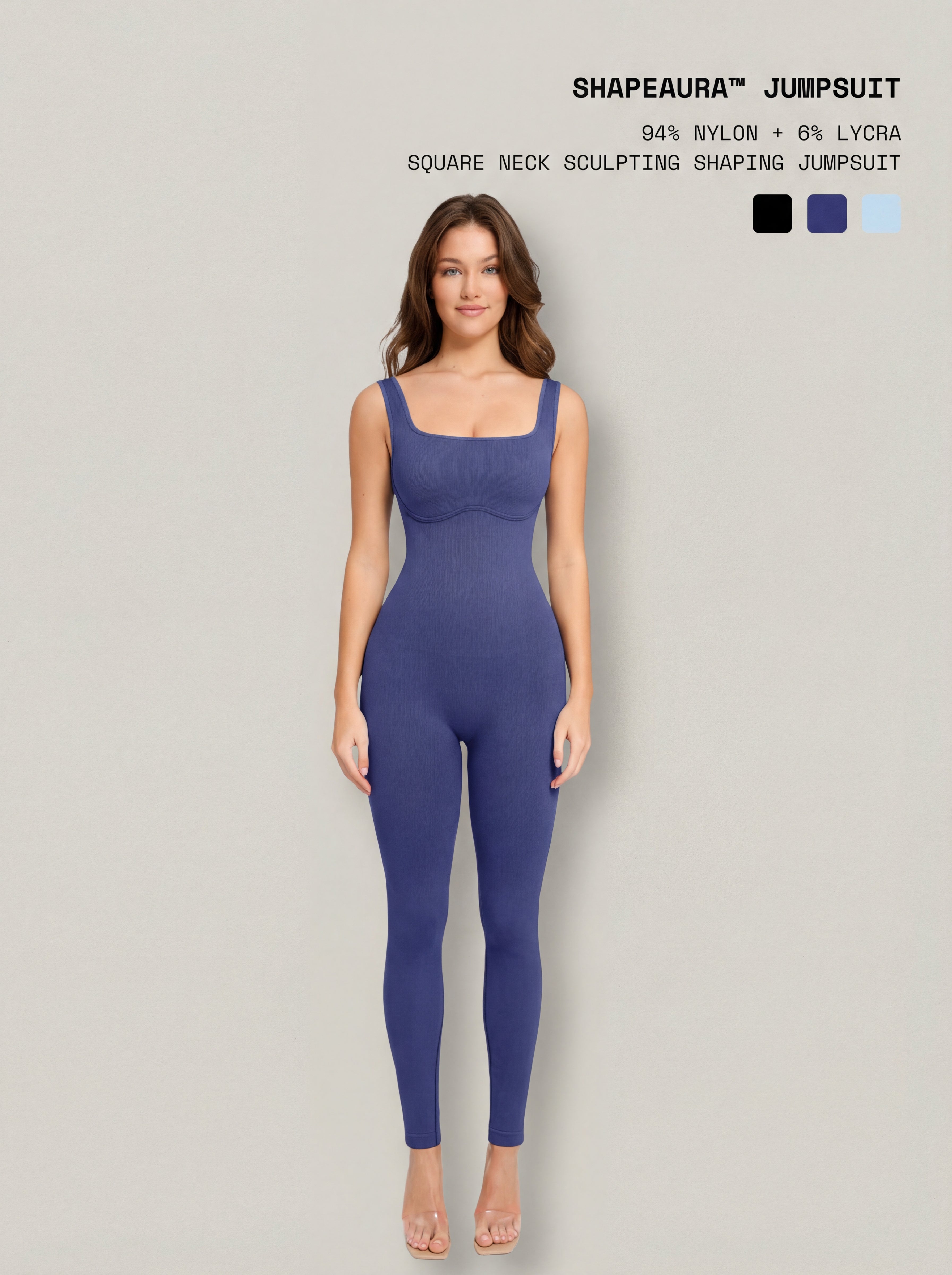 Sleek, sculpting, and effortlessly flattering, ShapeAura™ Jumpsuit is designed to contour your curves from bust to ankle with a smooth, seamless finish. The square neckline highlights the collarbone while the U-shaped back reveals a beautifully defined back silhouette. Built with targeted waist compression and a double-layered bust, it shapes, supports, and smooths without sacrificing comfort. Perfect for all-day wear, it transitions seamlessly from casual styling to elevated looks.