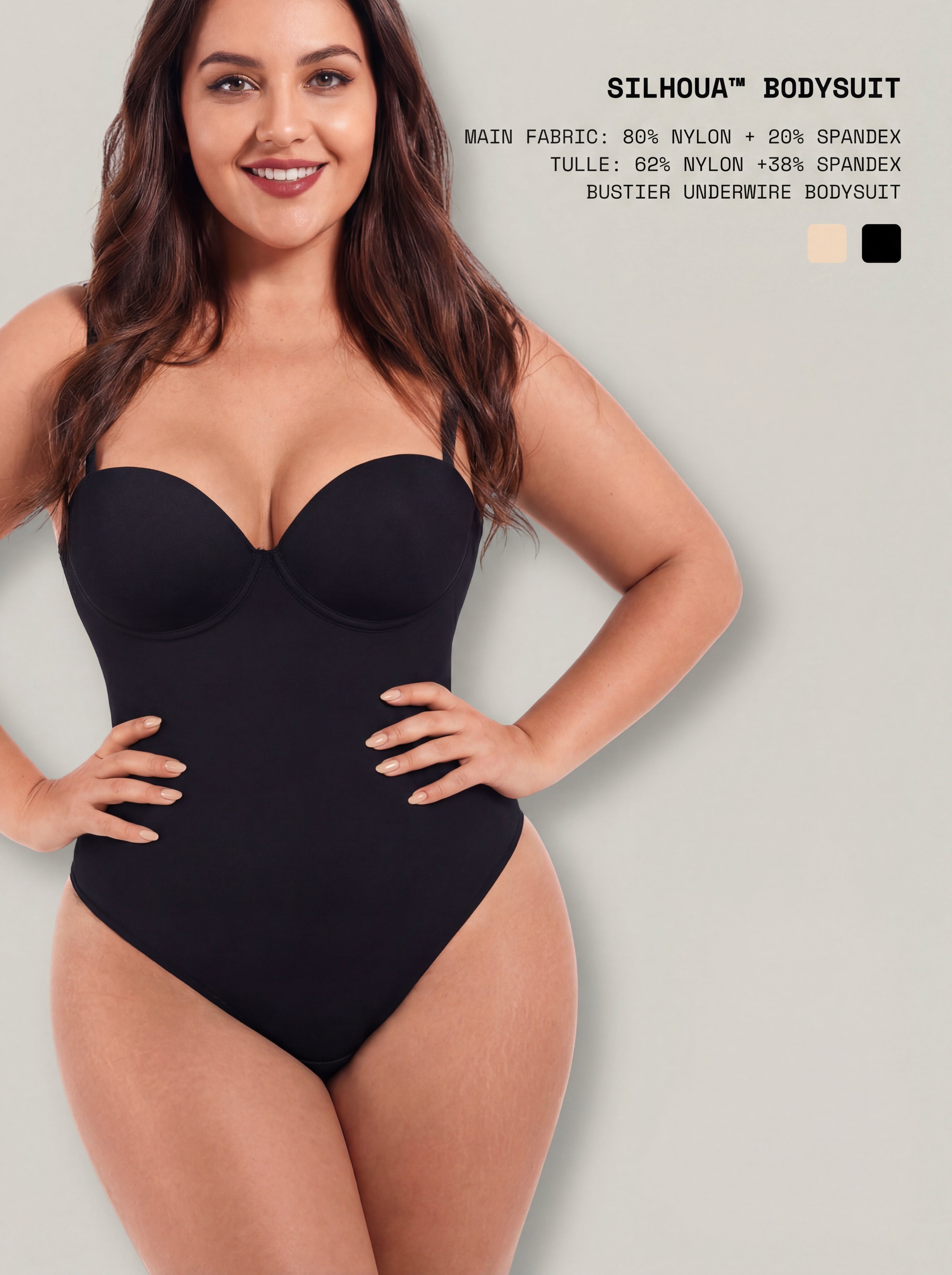 Elegant, breathable, and beautifully sculpting, Silhoua™ Bodysuit is designed to shape and support with a barely-there feel. Featuring a built-in underwire bra and targeted tummy compression, it smooths the waist while enhancing the bust for a naturally contoured silhouette. The deep U-shaped back and detachable straps make it perfect for low-back, strapless, and occasion wear looks. Finished with breathable, high-elastic fabric and a thong cut, it’s made for confident, all-day wear.