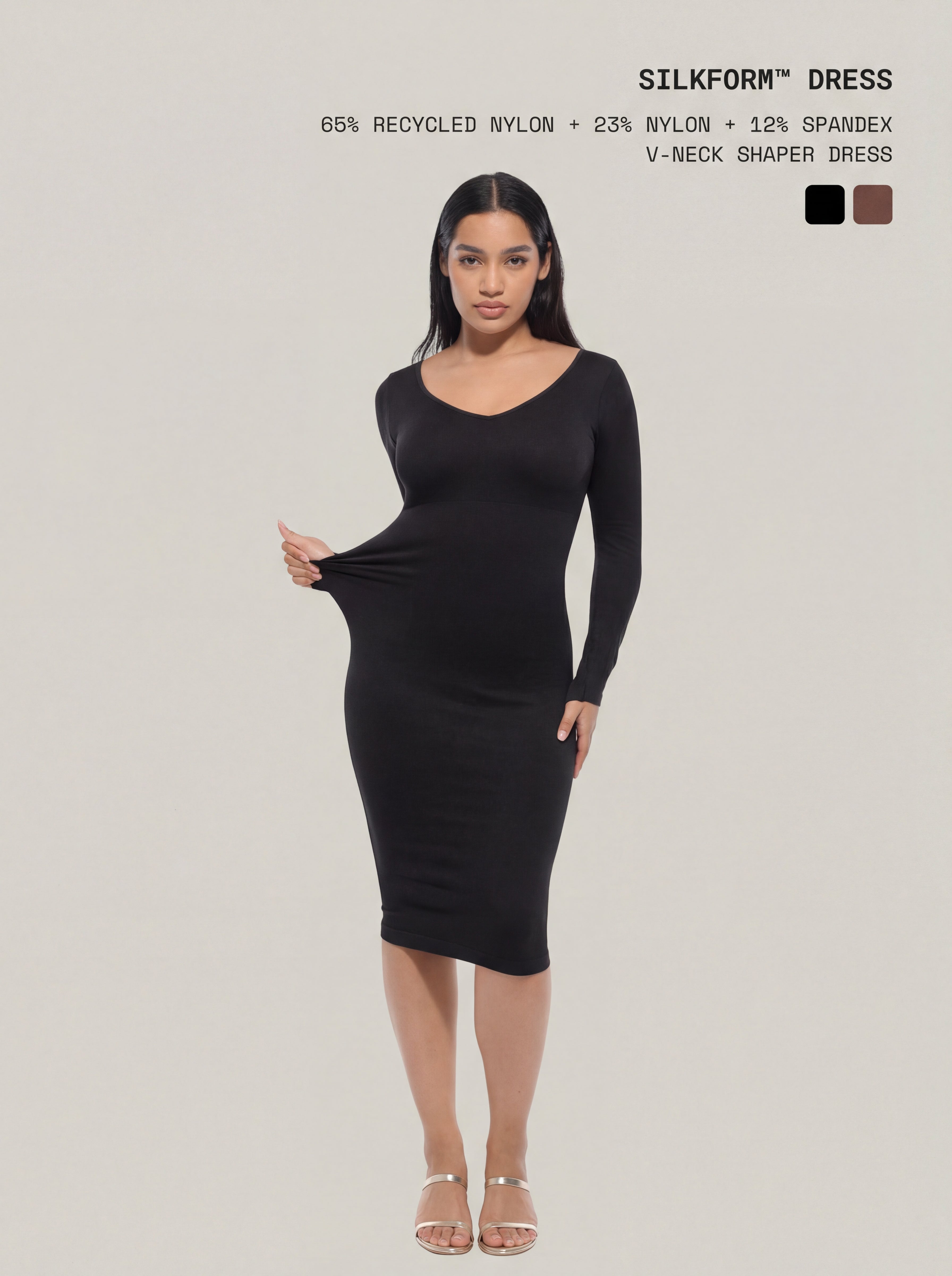 Smooth, refined, and naturally sculpting, the SilkForm™ dress is designed to contour your shape while feeling soft and breathable against the skin. This seamless shaping dress features built-in support and targeted waist compression to enhance your curves without stiffness or bulk. The V-neckline and long sleeves create a flattering, elongated silhouette, making it an easy choice for both casual wear and elevated looks.