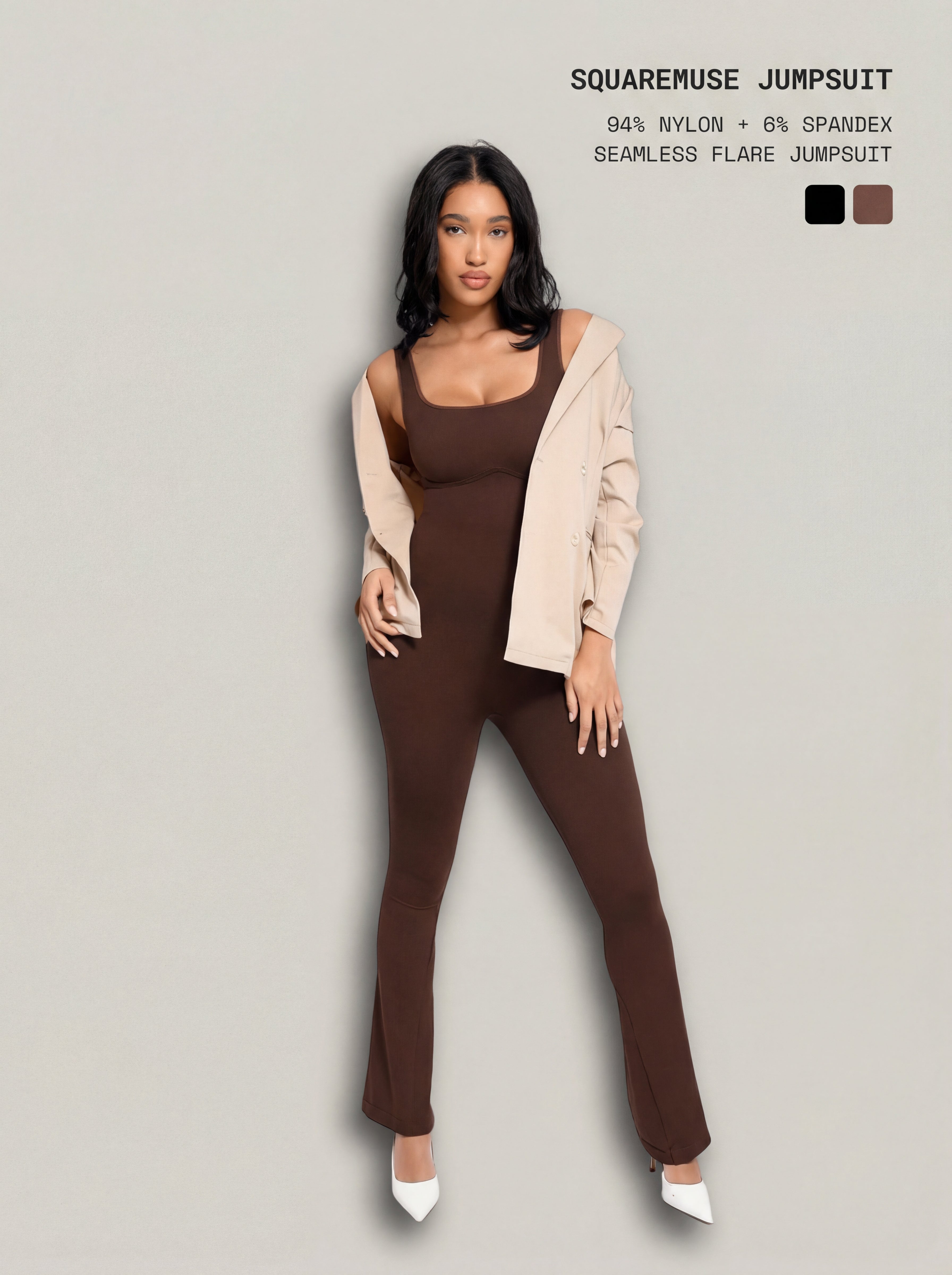 A sleek, square-neck one-piece with a daring U-back and leg-lengthening flare. SquareMuse Jumpsuit sculpts the waist and lower abdomen with a tighter knit, lifts the bust with a W-shaped under-bust design, and keeps coverage secure with a double-layer chest. The seamless, high-stretch fabric hugs smoothly for a polished silhouette from day to night.