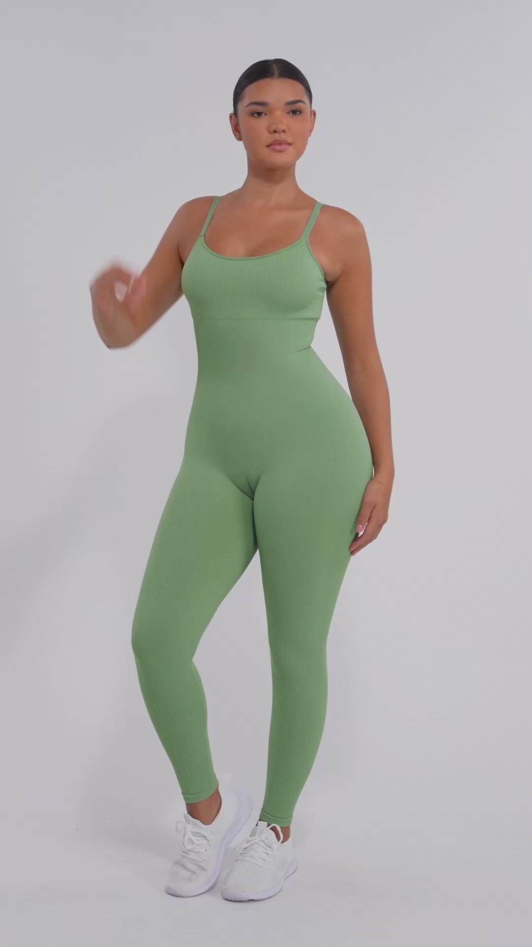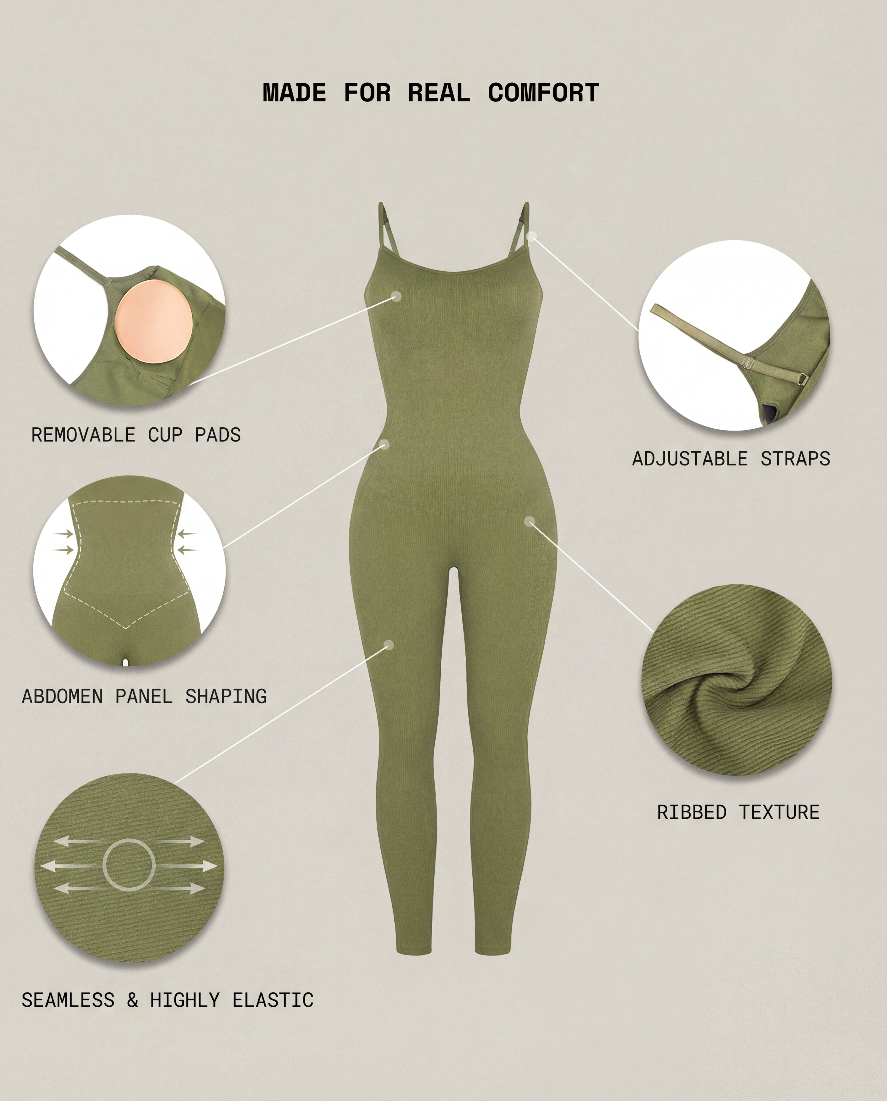 A sleek, sling-strap one-piece that smooths and supports while letting your curves breathe. StrapSculpt Jumpsuit pairs a double-layer bust with removable pads for confident coverage, a reinforced waist panel for tummy control, and adjustable straps to fine-tune your fit. The seamless ribbed knit moves like a second skin—polished enough to style up, comfortable enough for all-day wear.