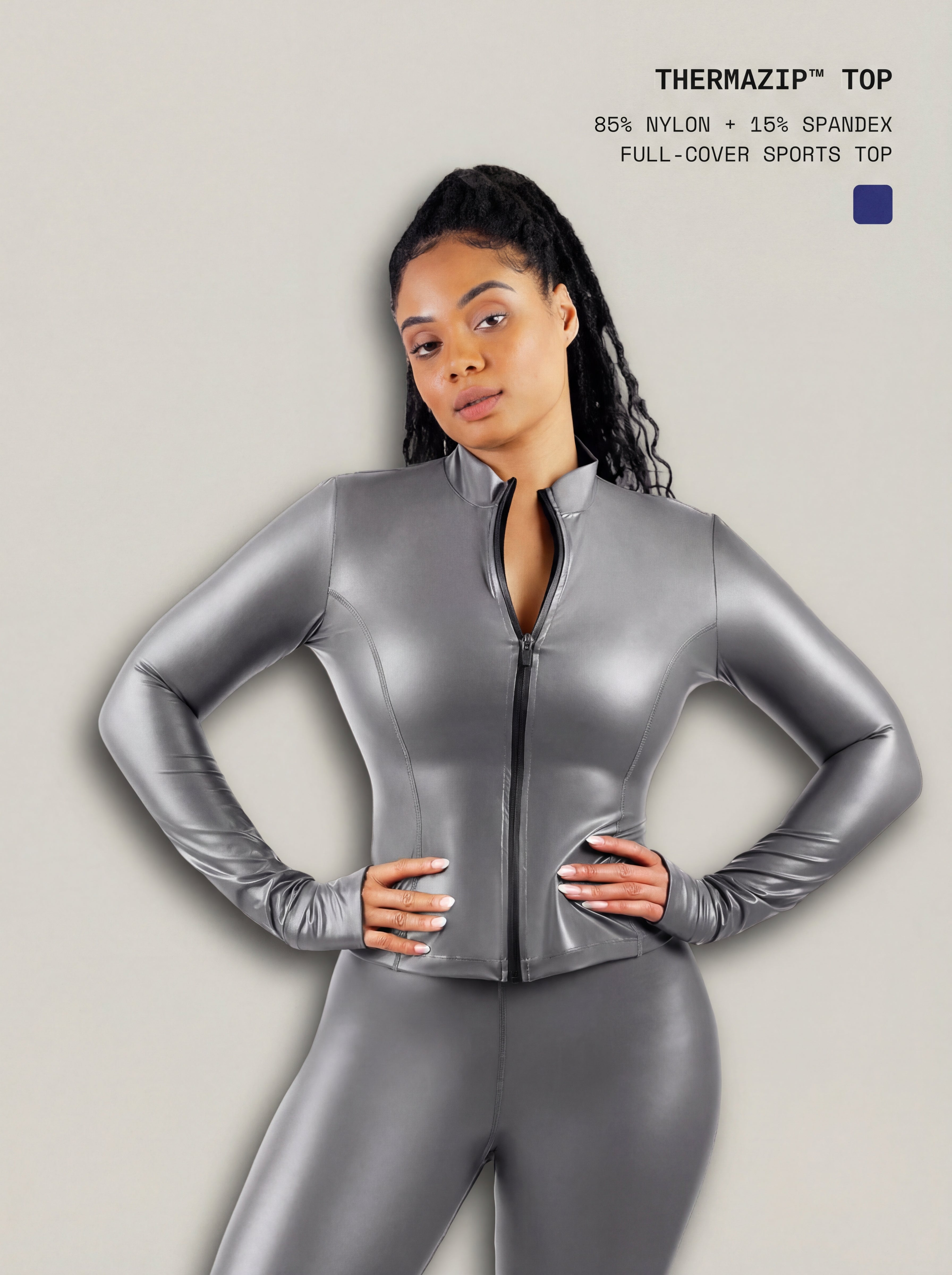 Sleek, supportive, and designed for active performance, the ThermaZip™ Top combines stretch, structure, and functional details for confident movement. Crafted with elastic, resilient fabric and a silver-film sauna lining, this long-sleeve sports top is made to support light workouts while maintaining comfort and flexibility. Finished with a high turtle neckline, thumb holes, and a durable waterproof zipper, it delivers a secure, streamlined fit with a sporty, modern edge.