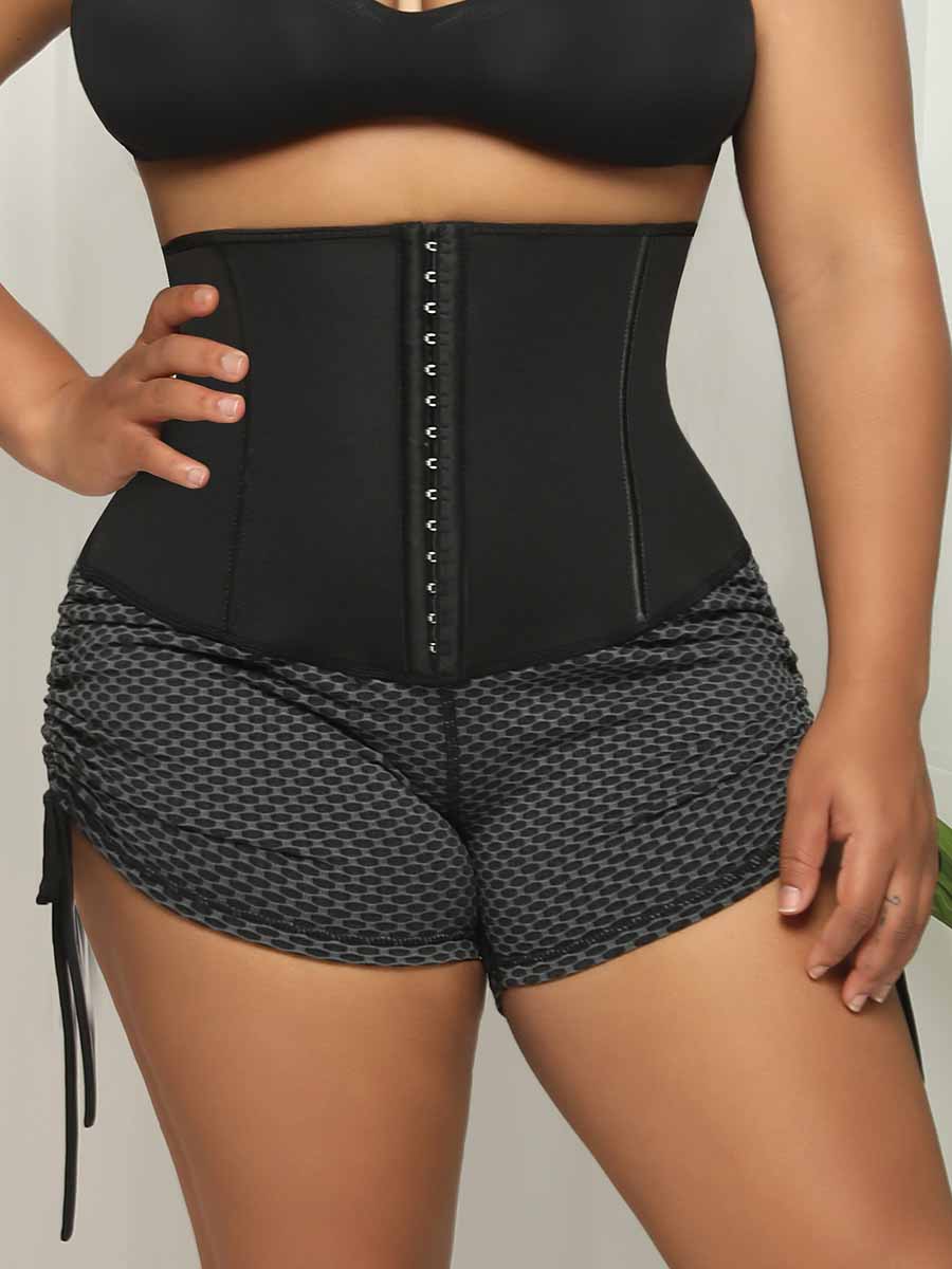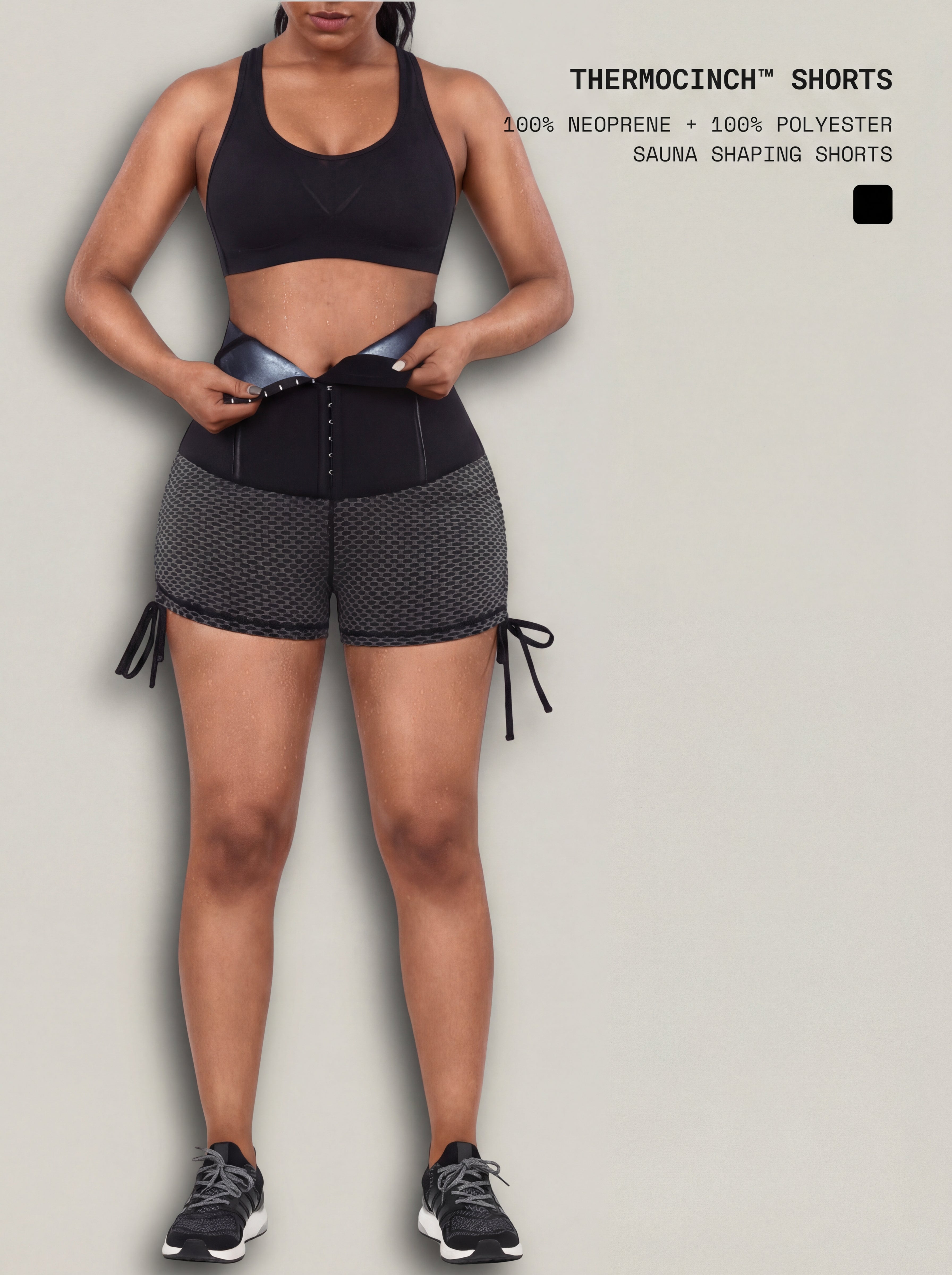 ThermoCinch™ Shorts are your sweat-forward sculpting essential designed to cinch the waist, smooth the tummy, and lift the curves with a confident, gym-ready finish. The neoprene PU-coated waistband creates a sauna-like heat effect around the midsection, while breathable honeycomb fabric keeps the legs comfortable and flexible. With strong boning support and an adjustable hook-and-eye closure, you control the compression and stay secure through every move. Finished with an M-shaped butt seam and adjustable drawstrings, it flatters your shape while you train.