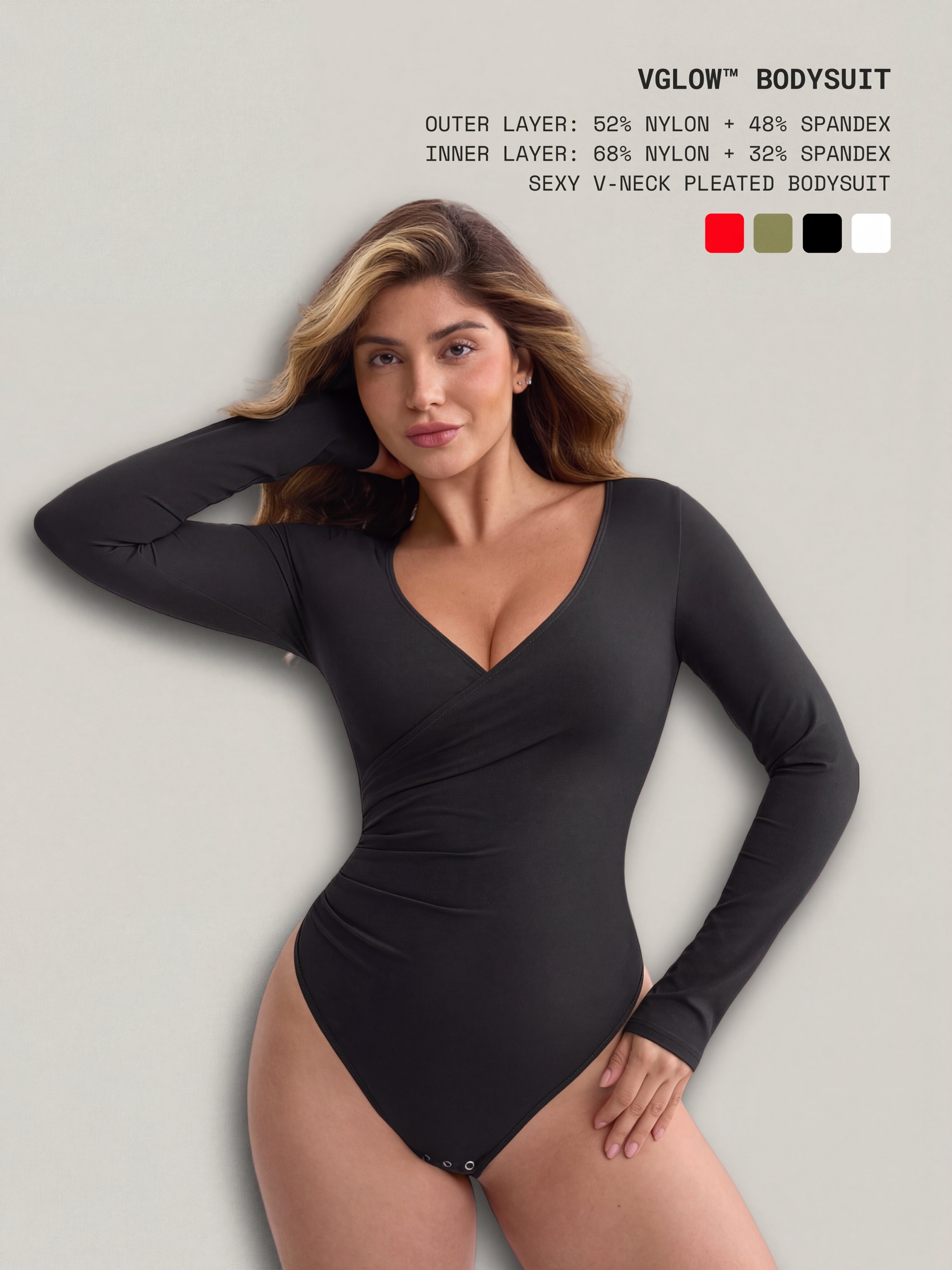 Meet VGlow™ Bodysuit, your sleek, confidence-first essential designed to flatter from every angle. The deep V-neck with an overlapping pleated front enhances the bust while creating a naturally snatched look through the waist. With a double-layer tummy panel—smooth stretch on the outside and shaping mesh within—it sculpts comfortably without feeling stiff. Finished with a seamless T-back and discreet snap closure, it disappears under outfits while keeping you perfectly put together.